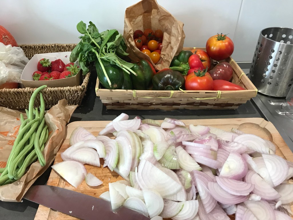 On Wednesday we gave the kitchen it’s first big test run. At the open-air market in Crozon, an organic farm was selling fabulous-looking produce. The plan for dinner quickly changed from something relatively simple to guvetch, a Balkan stew. Eggplant, zucchini, string beans, peppers, onions, garlic, tomatoes, basil – we got just about everything we needed there. Lamb and potatoes were all we needed to buy elsewhere. It was delicious! The organic strawberries, also from the same farm, were a fantastic finish to the meal.