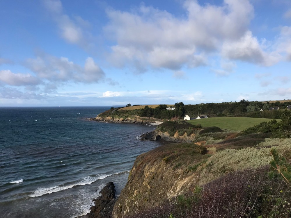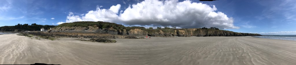 The Plage de Caméros (Caméros Beach) is just a short walk from our rental in Brittany. On the way we enjoy the flowers all around the home of our landlady’s parents, and wonder what they are going to do with all those apples and pears – at the moment they’re just dropping to the ground.