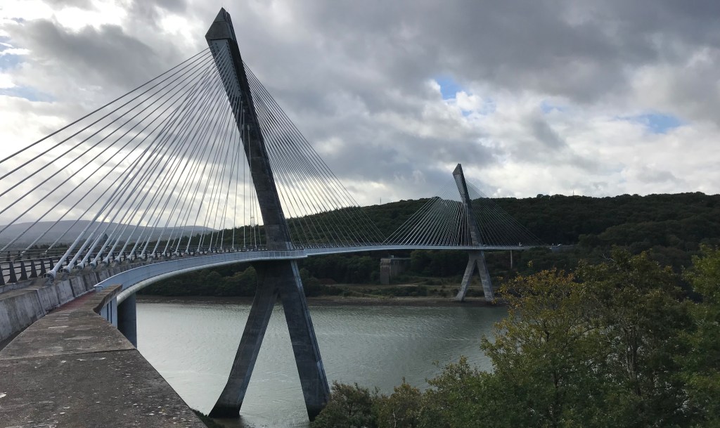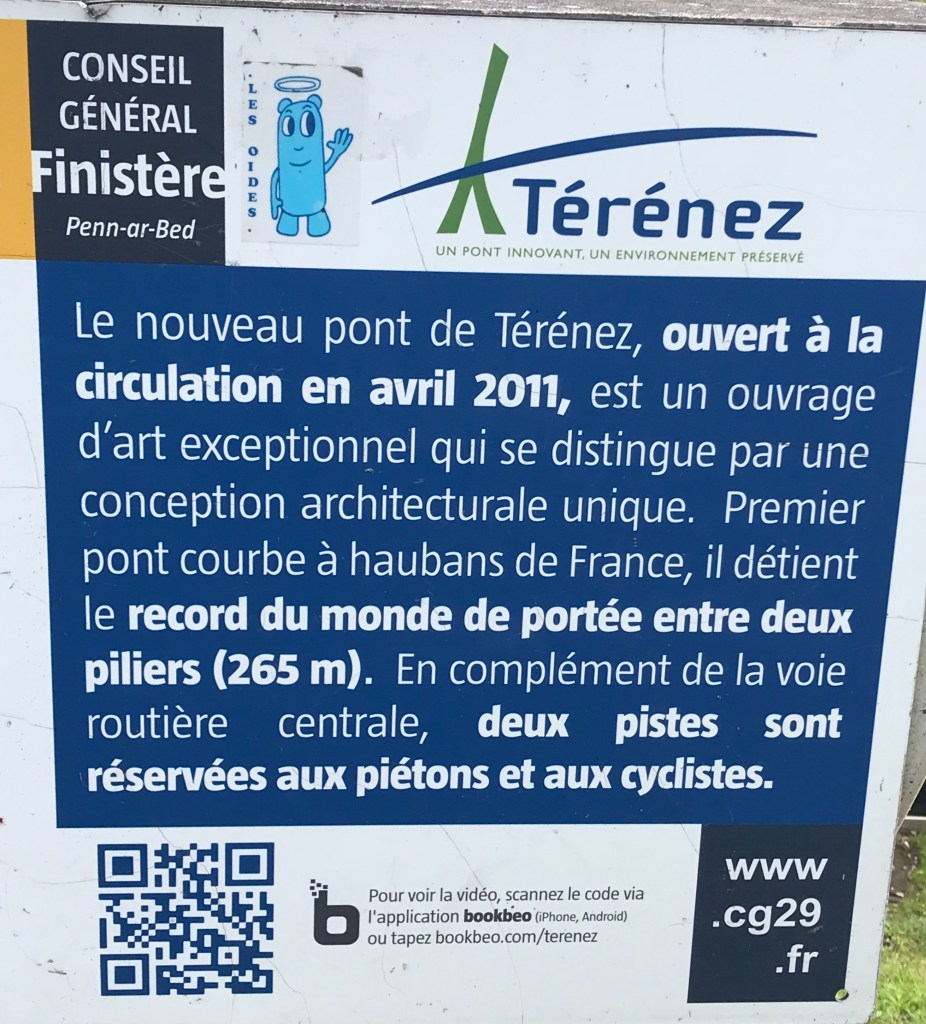 The sign says: The new bridge at Térénez, opened to traffic in April 2011, is an exceptional work of art distinguished by a unique architectural vision. The first curved bridge with guy wires in France, it holds the world record for the distance between pillars (265 m; 870 ft). In addition to the two traffic lanes, two paths are reserved for pedestrians and bikes. [translation by J]