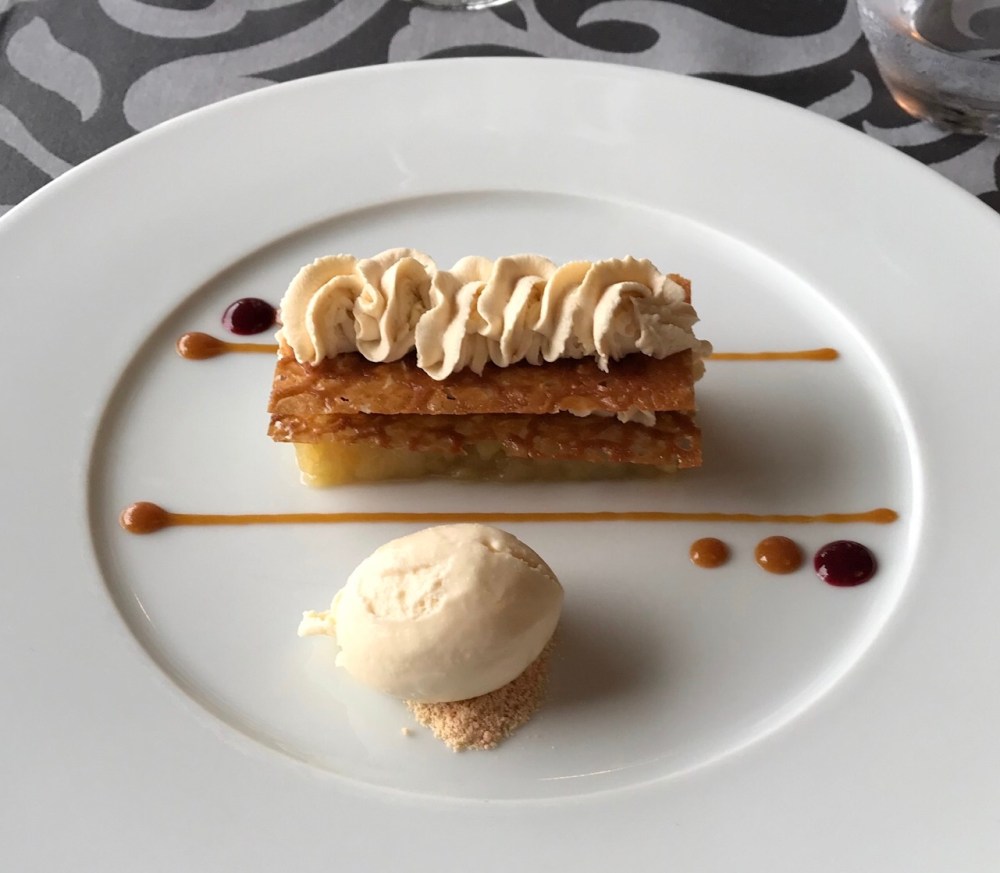 Dessert was an Opéra (with coffee butter cream, caramel, sea salt) and Bailey’s irish cream ice cream for J and the taste of Brittany for M – apples, buckwheat crisp, caramel cream, and buckwheat ice cream. Followed by coffee. Oh, yeah…