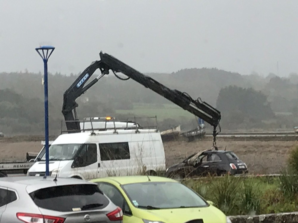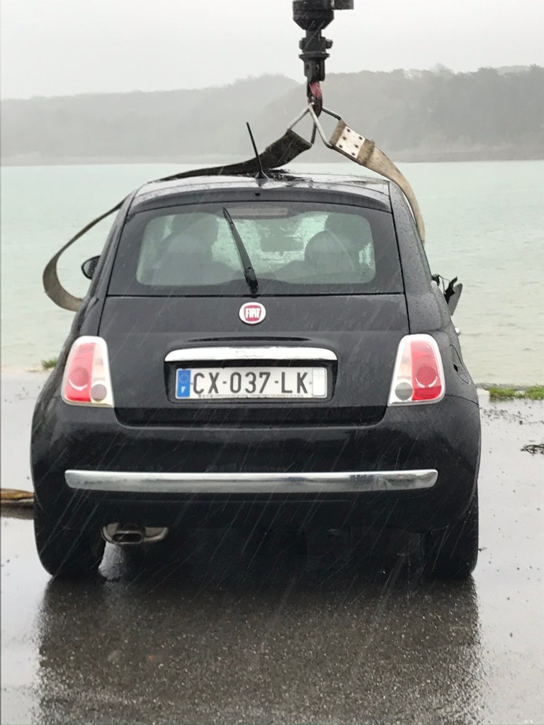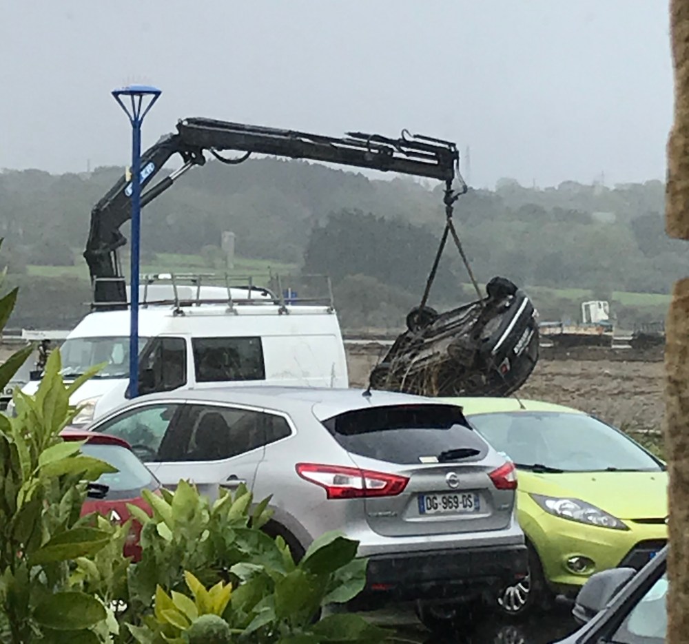 As we had our desserts, a tow truck came with a nifty, long-extension crane and brought the car back up. (By that time the tide was coming in and the car must have been partially submerged…)