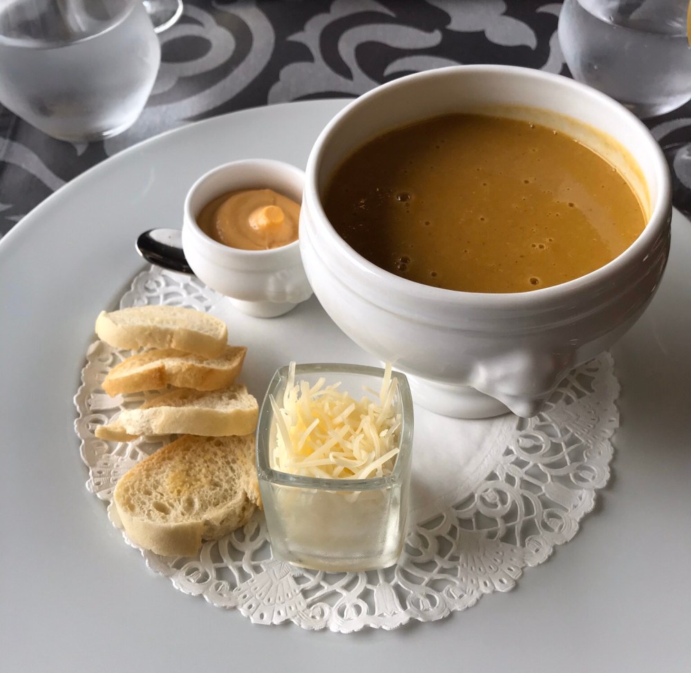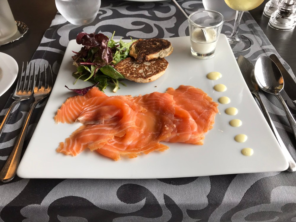 J started with smoked salmon and buckwheat blini, while M had fish soup. If you think “fish soup” doesn’t sound like much, think again. It was delicious alone, but when you added the toasts with aioli and the cheese – wow! J’s house-smoked salmon was excellent, but not on a par with the fish soup…