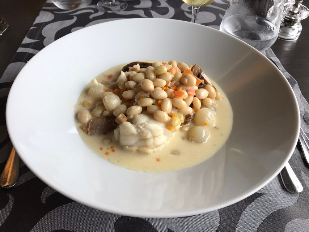 The tide turned the other way with the mains, however. J had monkfish in a white sauce with white beans and sausage that was heavenly. M’s braised pork with cheesy potatoes and bacon was good, but not on the same level as his fish soup.