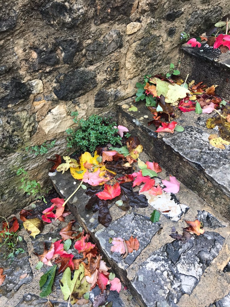As it started to rain again, we scurried back home, stopping only long enough to capture this bit of fallen fall color – something we see very little of in France.