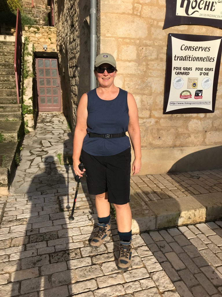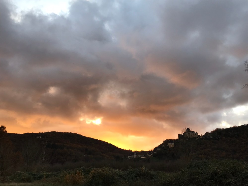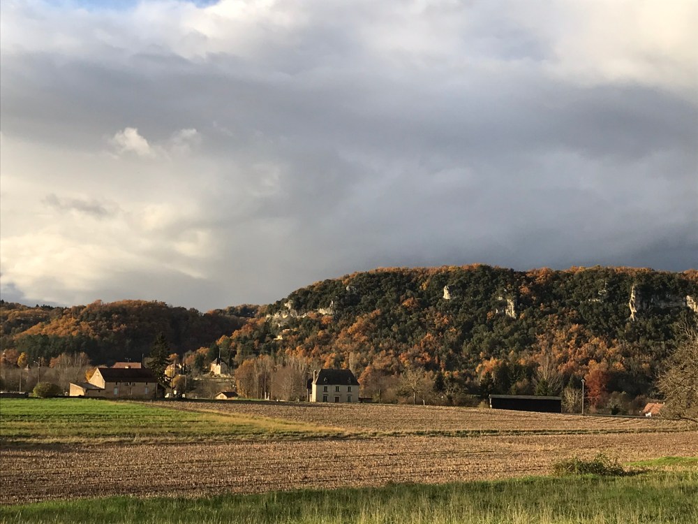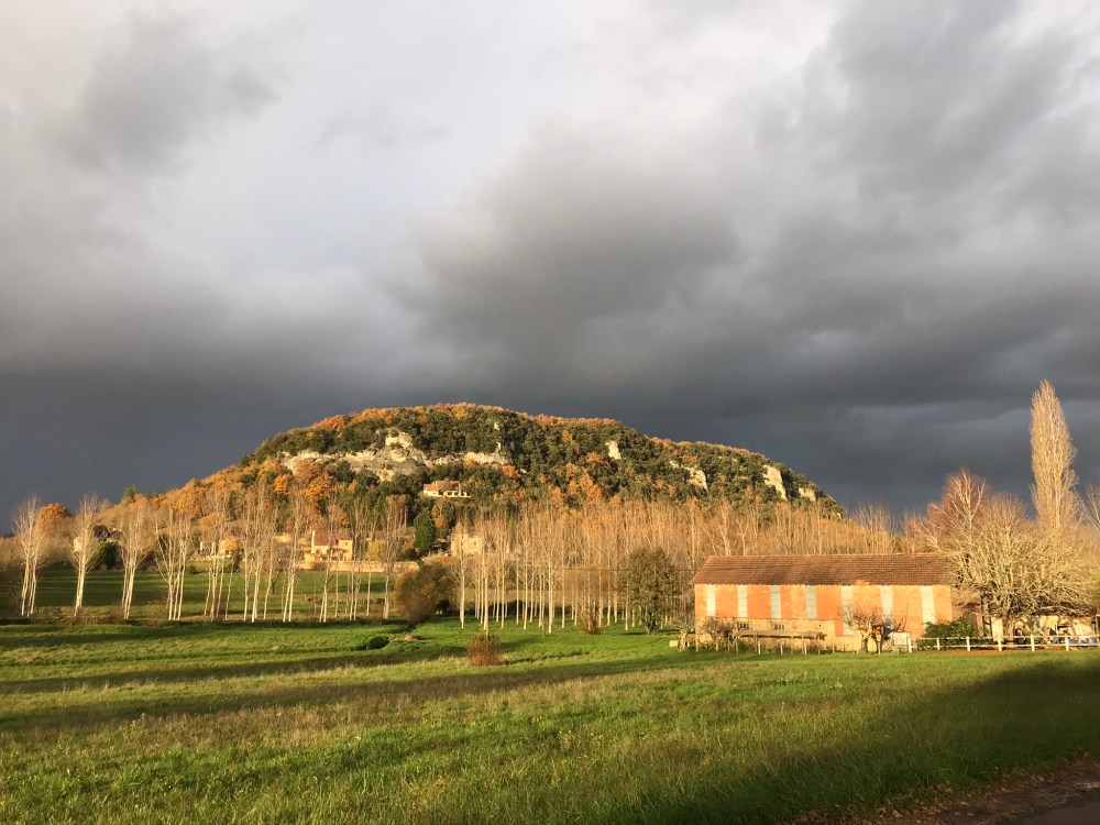 Fueled by our Thanksgiving leftovers, we headed out from La Roque-Gageac this afternoon on a hike that looped to the north and west of the village. It was amazingly warm – we never expected to be dressed like this on November 29th: