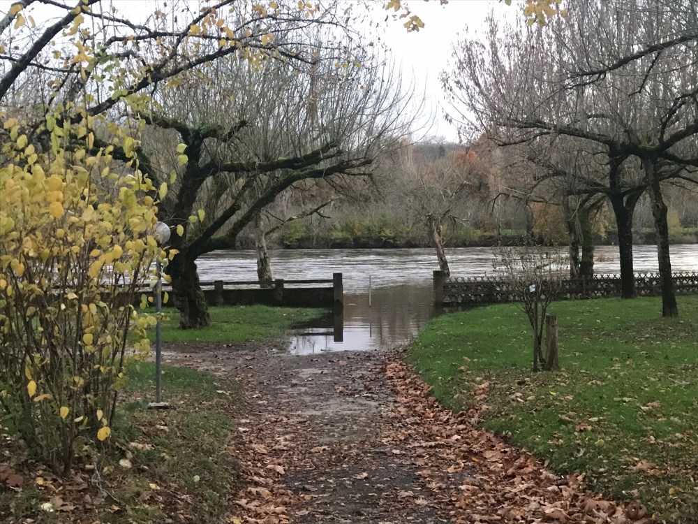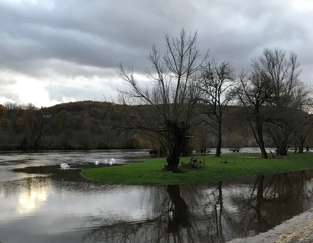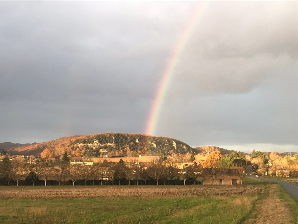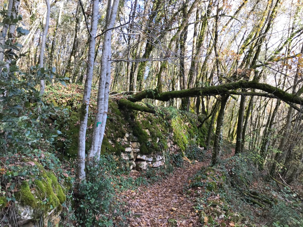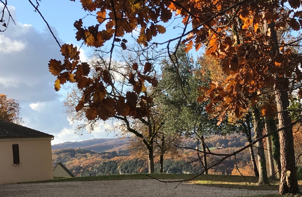 Fueled by our Thanksgiving leftovers, we headed out from La Roque-Gageac this afternoon on a hike that looped to the north and west of the village. It was amazingly warm – we never expected to be dressed like this on November 29th: