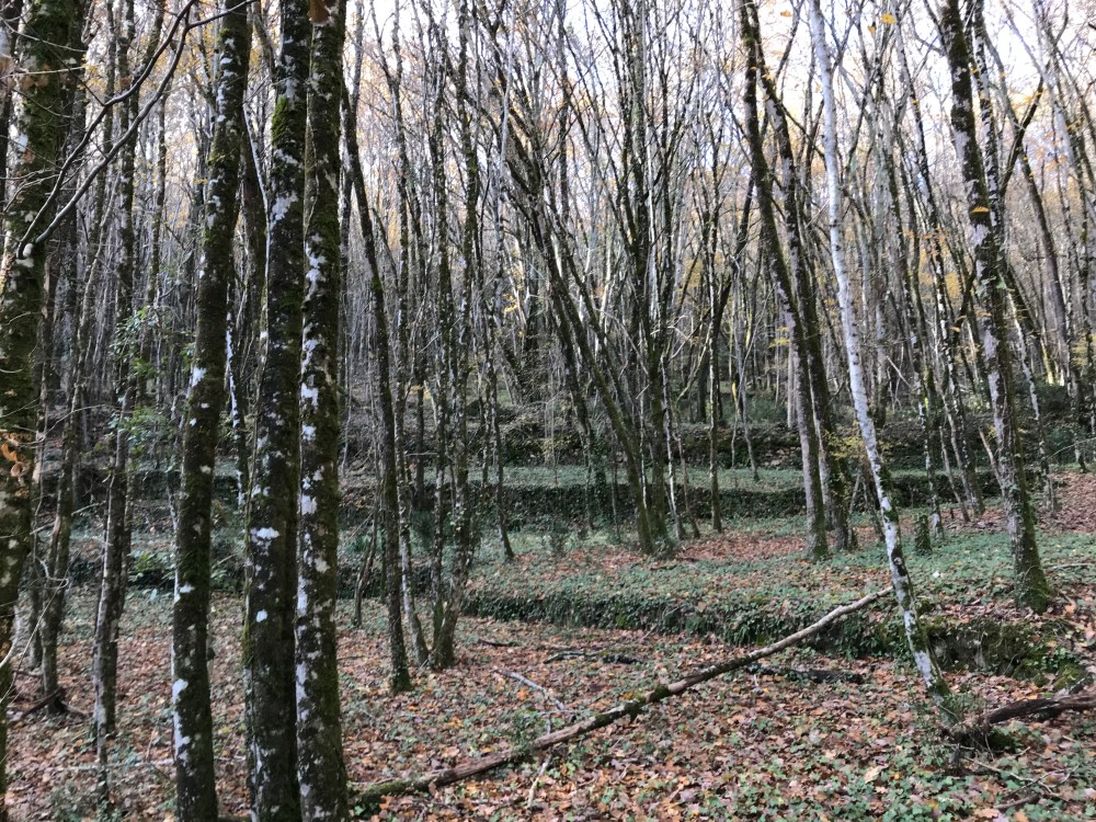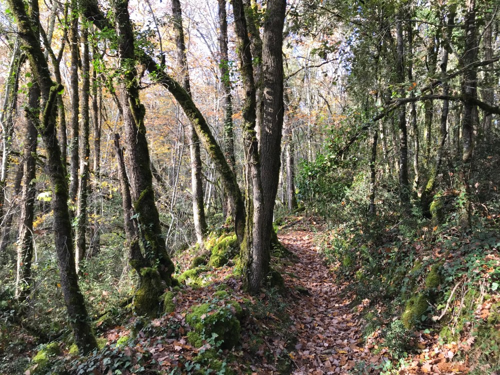 After a short walk on a road, we headed up into the trees. I’m still amazed at all the walls and terraces we see out in the middle of the woods. Much of our uphill walk was on what must have once been a narrow lane between stone walls.