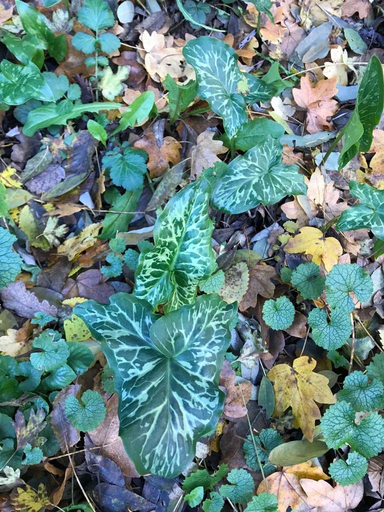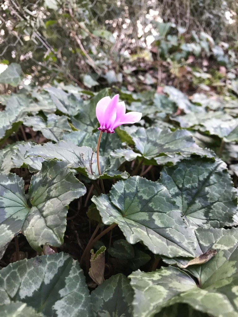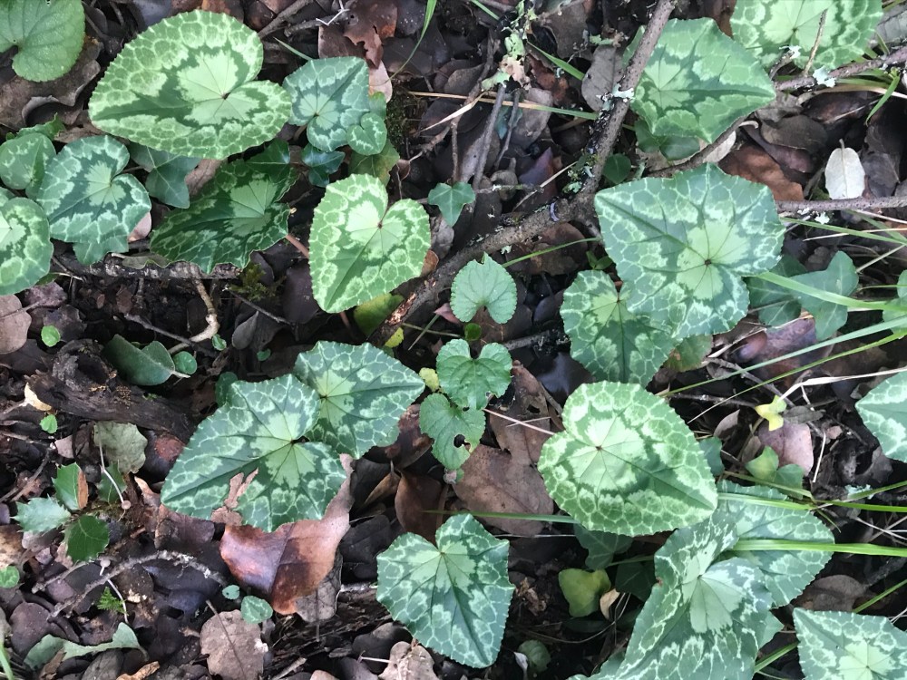 We continue to see many plants that are too tender to survive the winters at home. Are they all native, or are some escaped houseplants running wild? This cyclamen has fabulous leaves to complement its delicate flowers:
