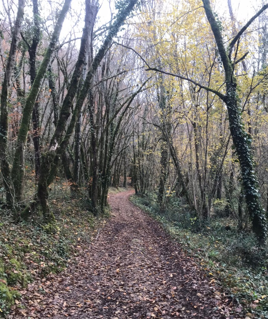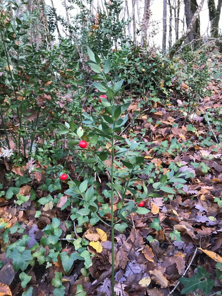 The woods are full of low bushes with red berries, perhaps a type of holly? On yesterday’s hike, we saw almost no berries, but lots of clipped bits of branches on the path. We suspect that people are out gathering them for Christmas decorations…