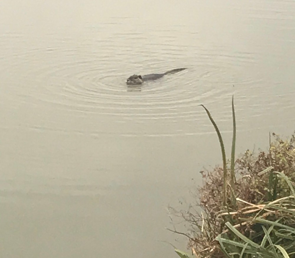 To our surprise, a big splash alerted us to a critter. I can’t imagine swimming around in that murky water, but it seemed happy enough. I’m guessing it’s a nutria, but aquatic rodent identification isn’t one of our fortes.
