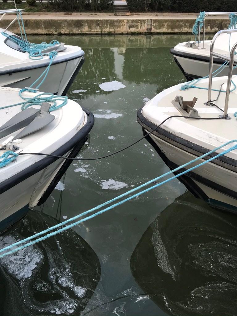 I don’t know if there’s a French version of the EPA, but it seems unlikely that doing your fiberglass work over the water and letting everything fall in is legal. This may help explain why the canal looks like green milk of magnesia…