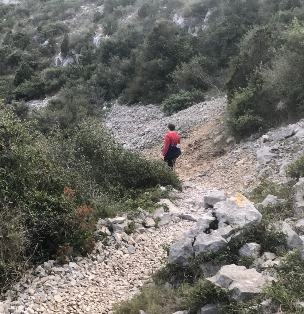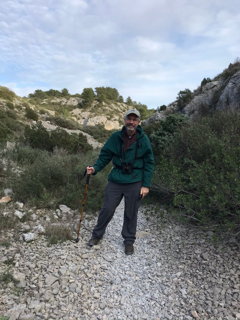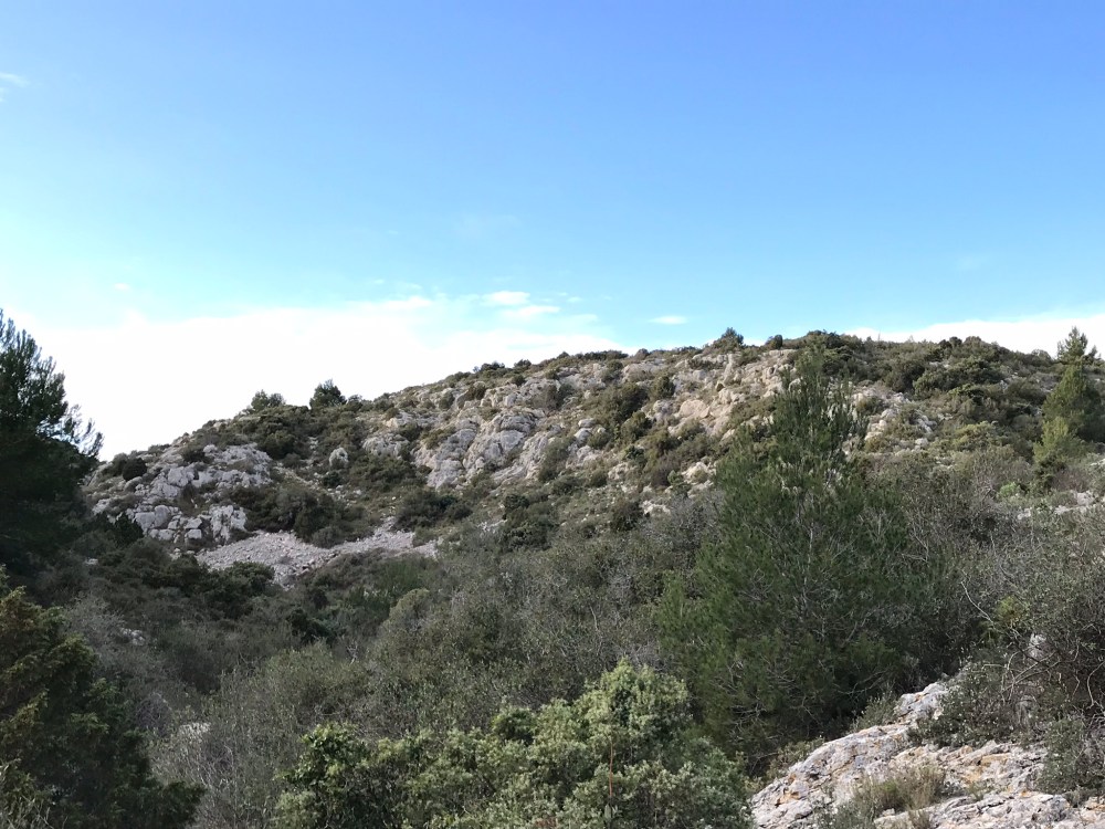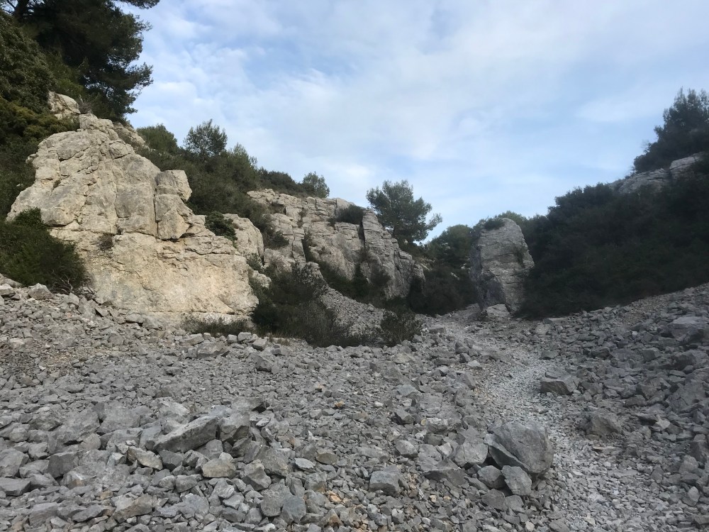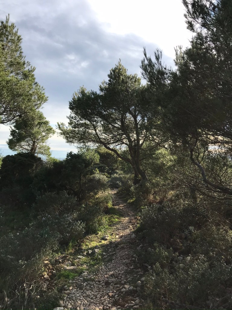 Across the top of the massif, the garrigue, as the French call this type of area, is very rocky with mostly low scrub, with lots of rosemary here. The smell as you brush past it is delightful.