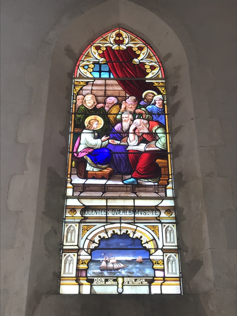 We visited the church in La Couarde for the first time. The stained glass window above tickled J’s fancy. All the other windows just showed saints. This one, donated by a retired naval officer, has ships with no obvious religious context – everyone has their priorities!
