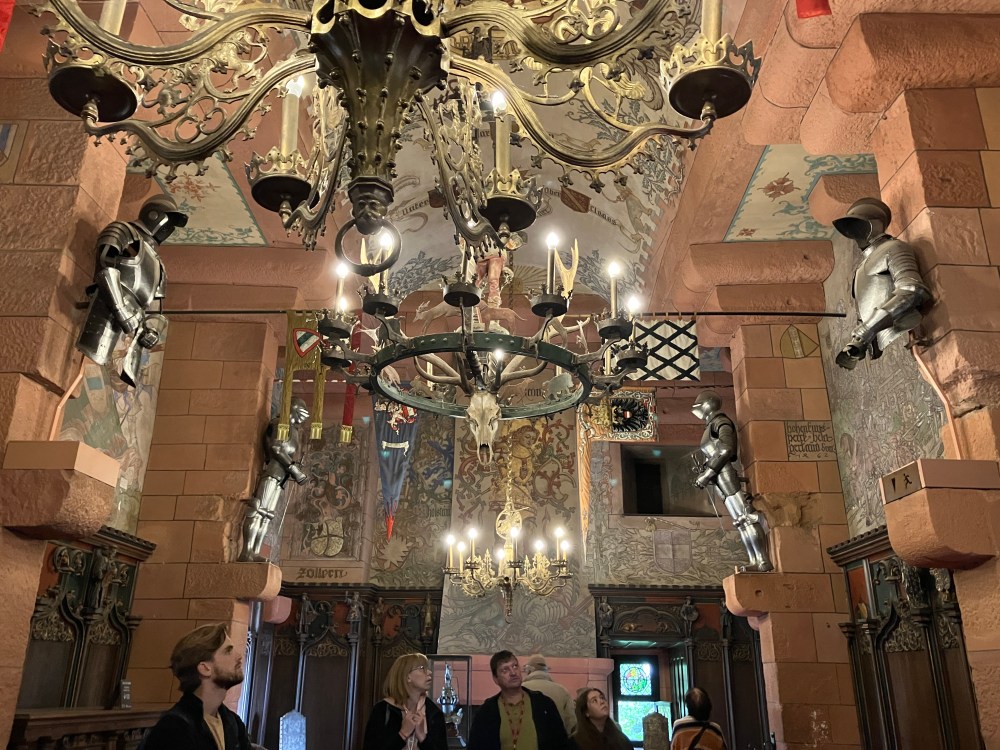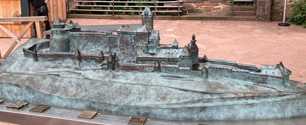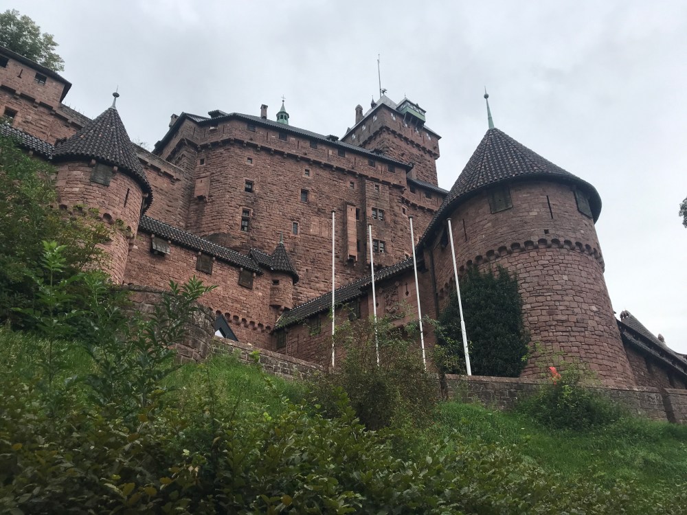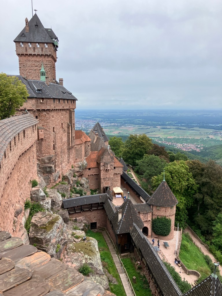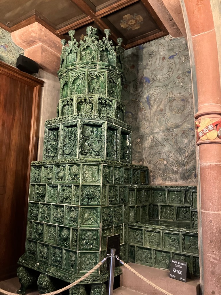 As we drove to Colmar on Sunday, we saw a castle on top of the pointiest hill around. On Monday, we visited it – the Chateau de Haut-Koenigsbourg. (Yet another fine mix of French and German names here in Alsace…) This castle has had a hard life. First mentioned in 1147, it was destroyed in 1462. (Though that may not have been such a bad thing, since it was occupied by brigand knights.) Rebuilt in 1479, it was destroyed again by the Swedes in 1633, during the Thirty-Years War. In 1899, the town gave it to Kaiser Wilhelm II.