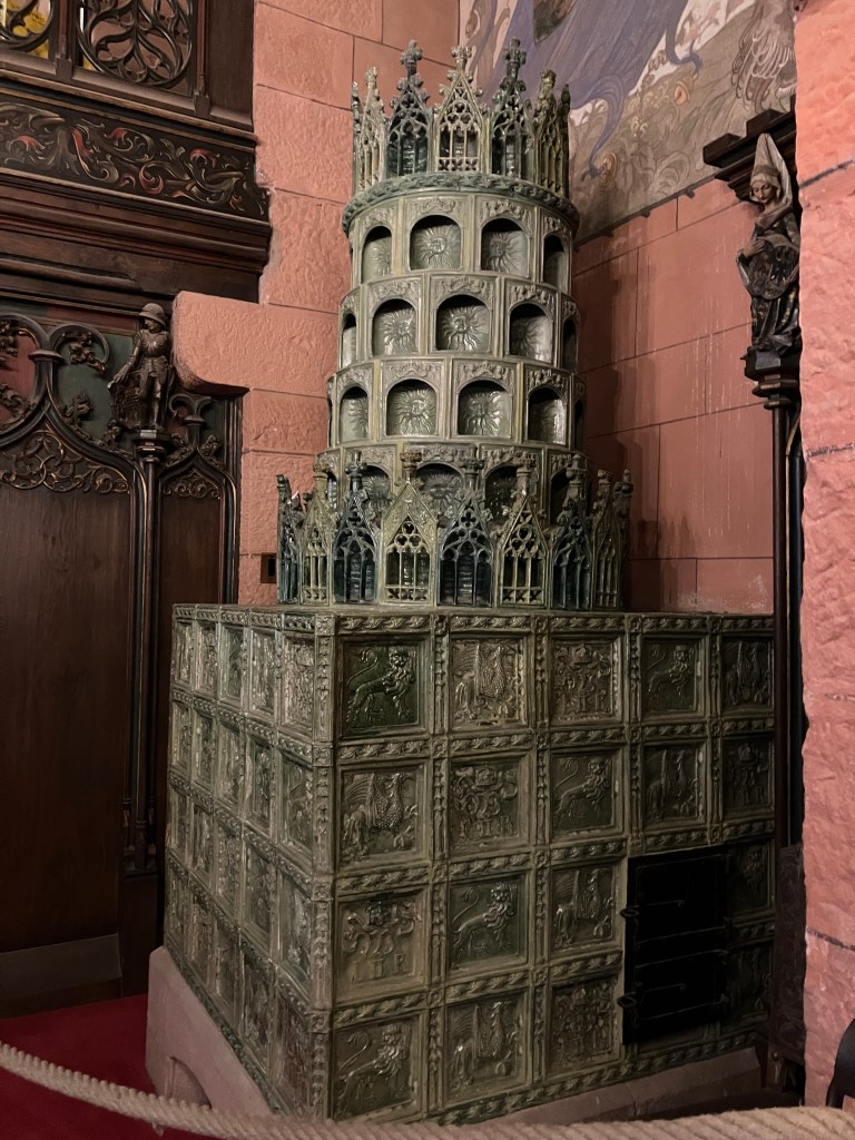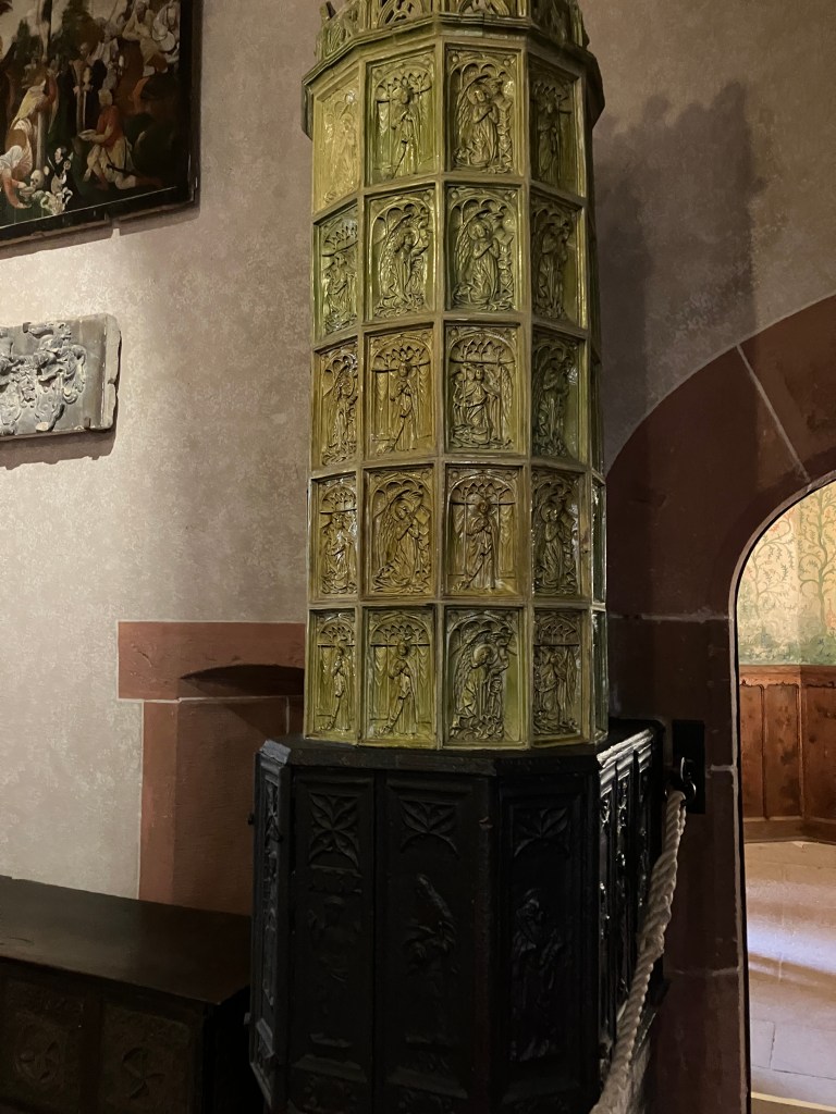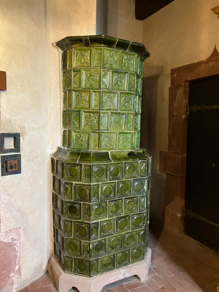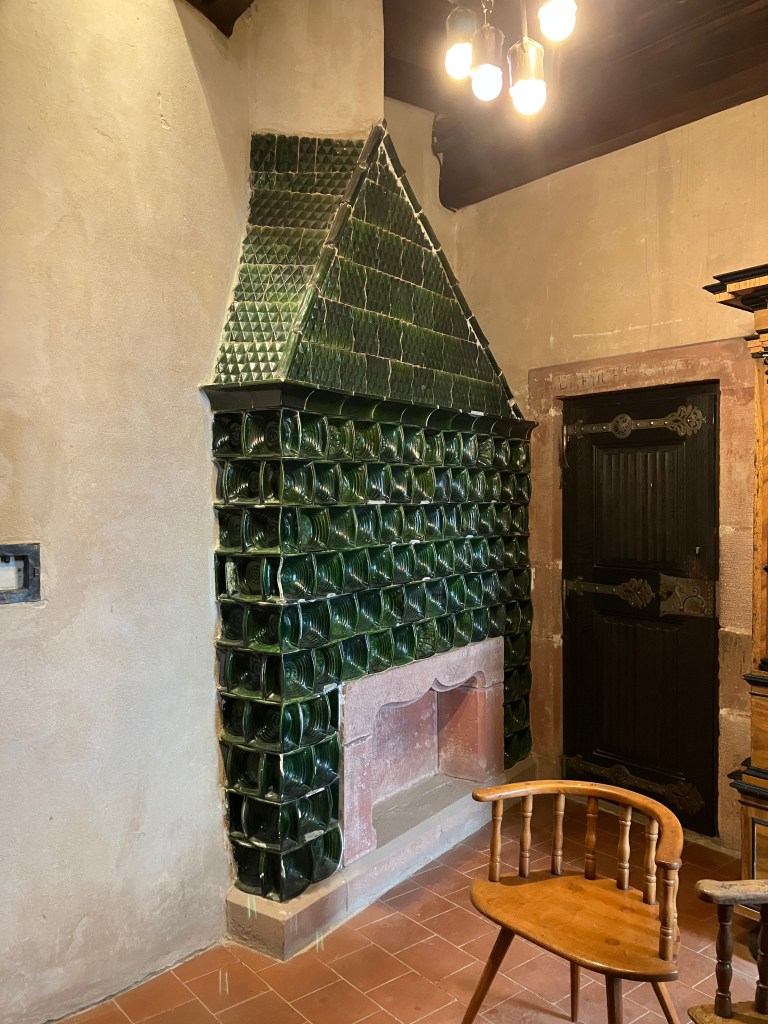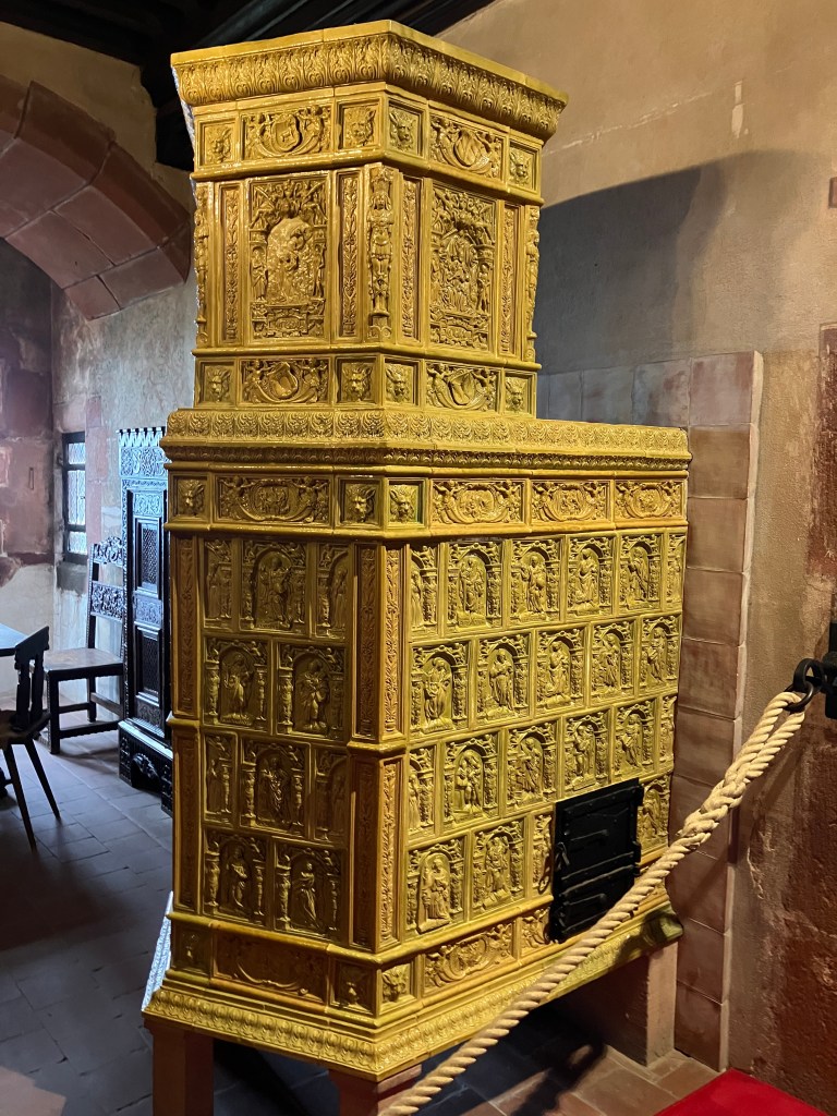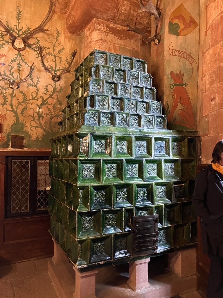 I was fascinated by the ceramic stoves. Each has dozens of detailed handmade tiles. The one with the attached seat looks particularly cozy.