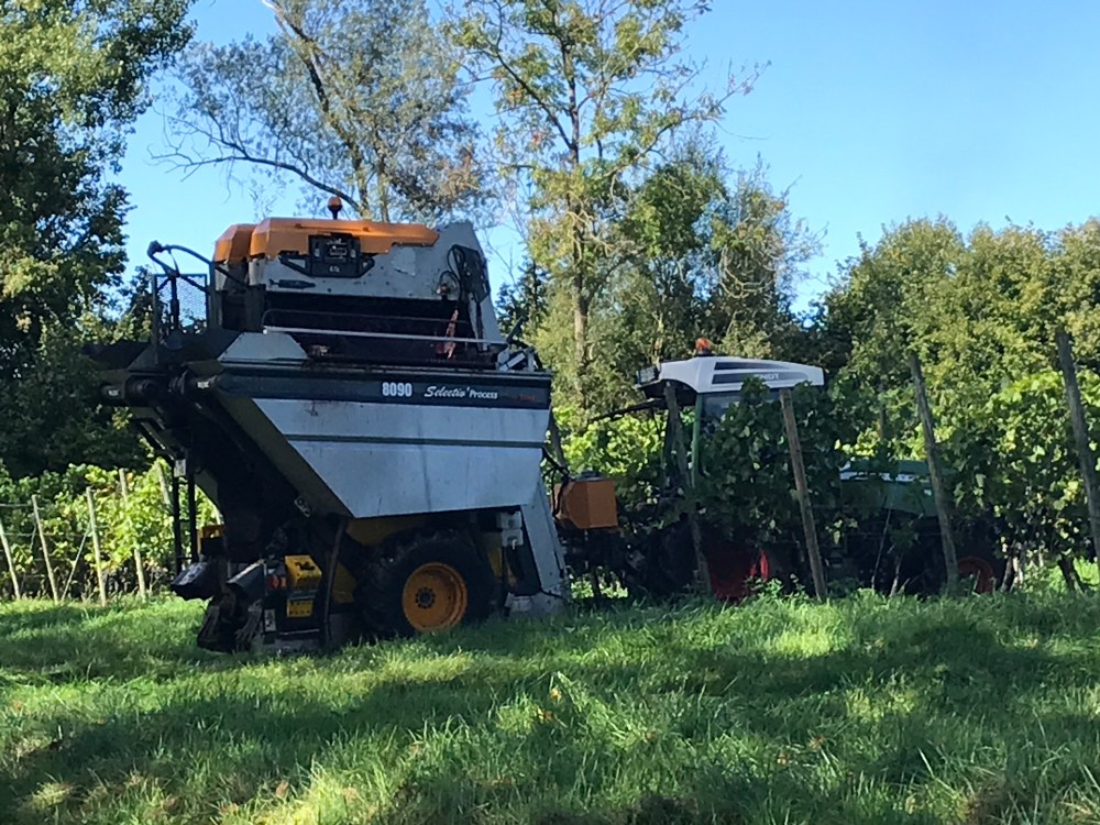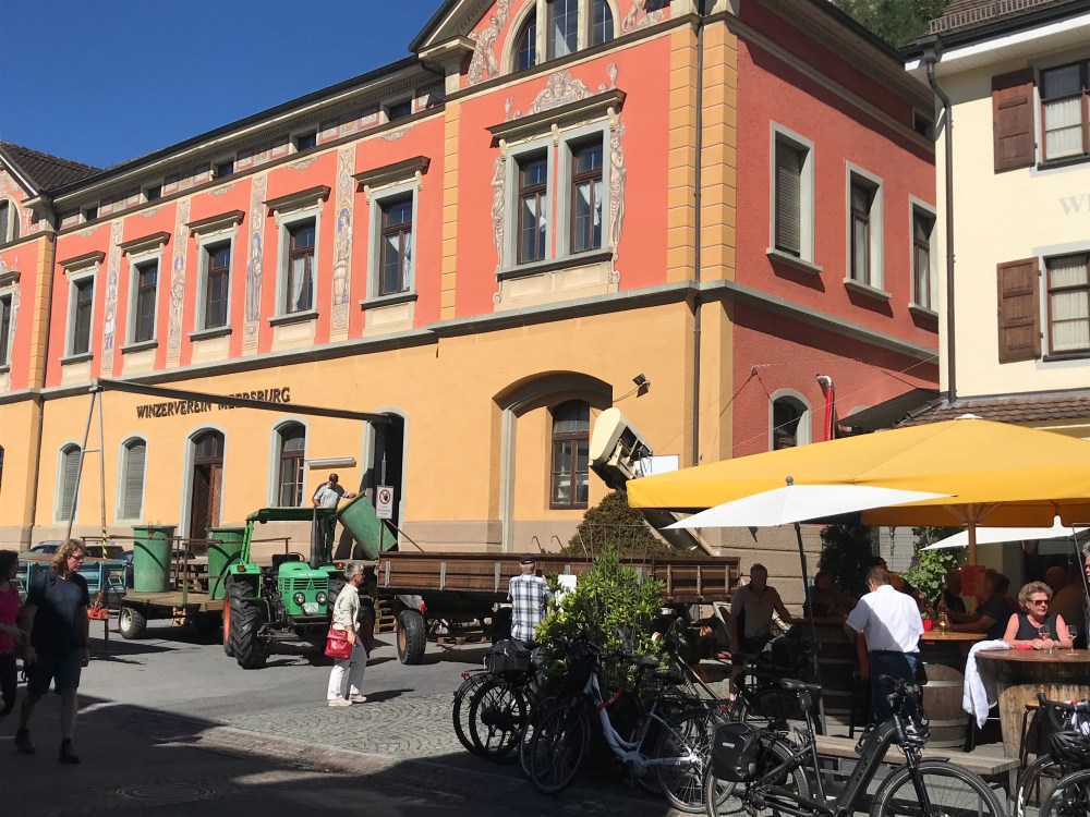 in Meersburg we saw grapes being harvested with a fancy machine (the tractor is on one side of the vines, the wafon is on the other) and then the grapes being processed at a cooperative right in the center of town – the tractors drove through the hordes of tourists.