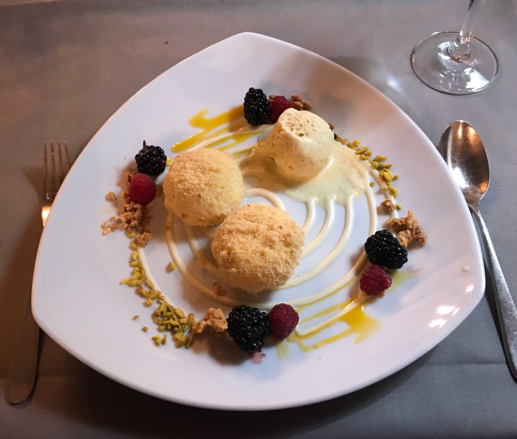 For dessert, I tried the Marillenknödel (apricot dumplings), a Bohemian/Austrian specialty – far more delicate than I expected, and delicious. M enjoyed a chocolate mousse duo.