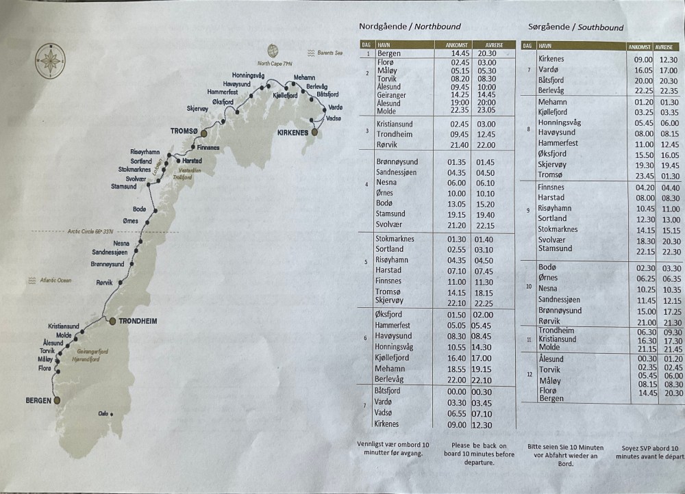 The Havila ships are mail boats, delivering mail and packages all along the coast. We’ve booked a 12-day roundtrip, but some people use it to travel shorter distances. They even have a lounge aboard with recliners you can book if you’re only traveling a few hours. Some port calls are just 10 minutes long.