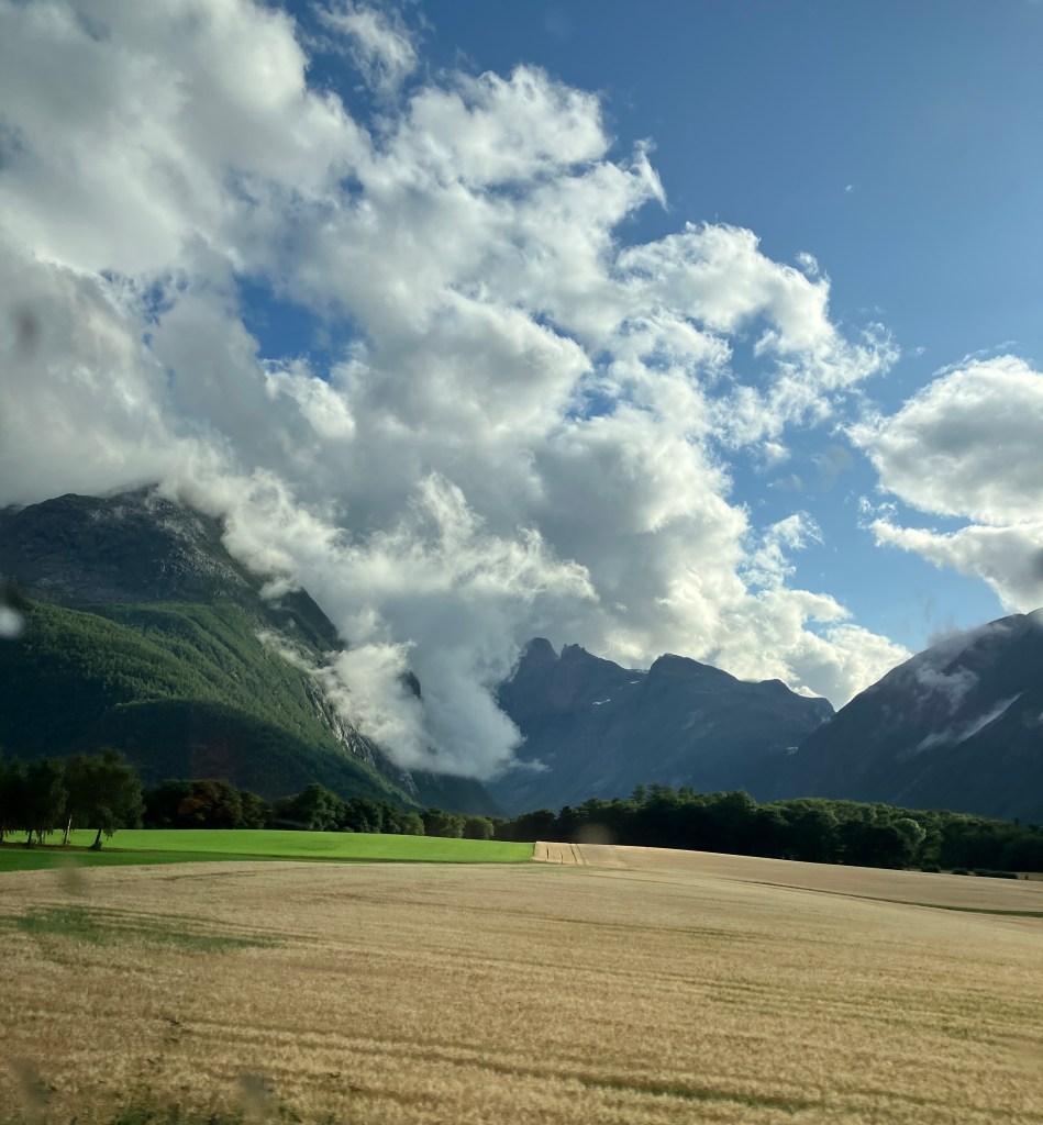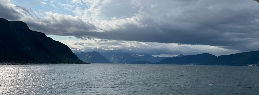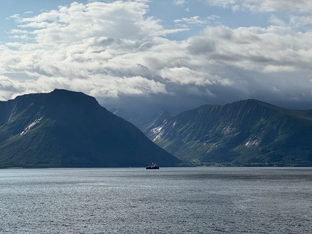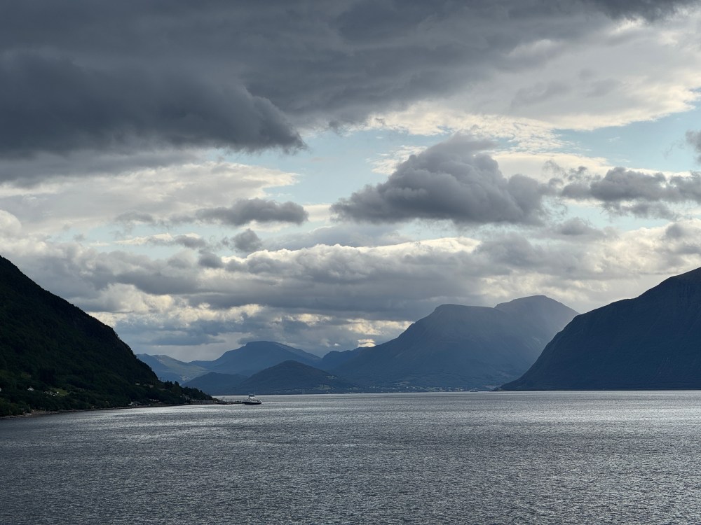 The scenery has been stunning. We’ve run out of superlatives as we walk on deck or look out the windows, dashing out on the balcony to take yet more pictures. Not just the landscape is beautiful – the clouds are dramatic, too. Which explains why the weather reminds us of Scotland – it could rain or shine at any moment!