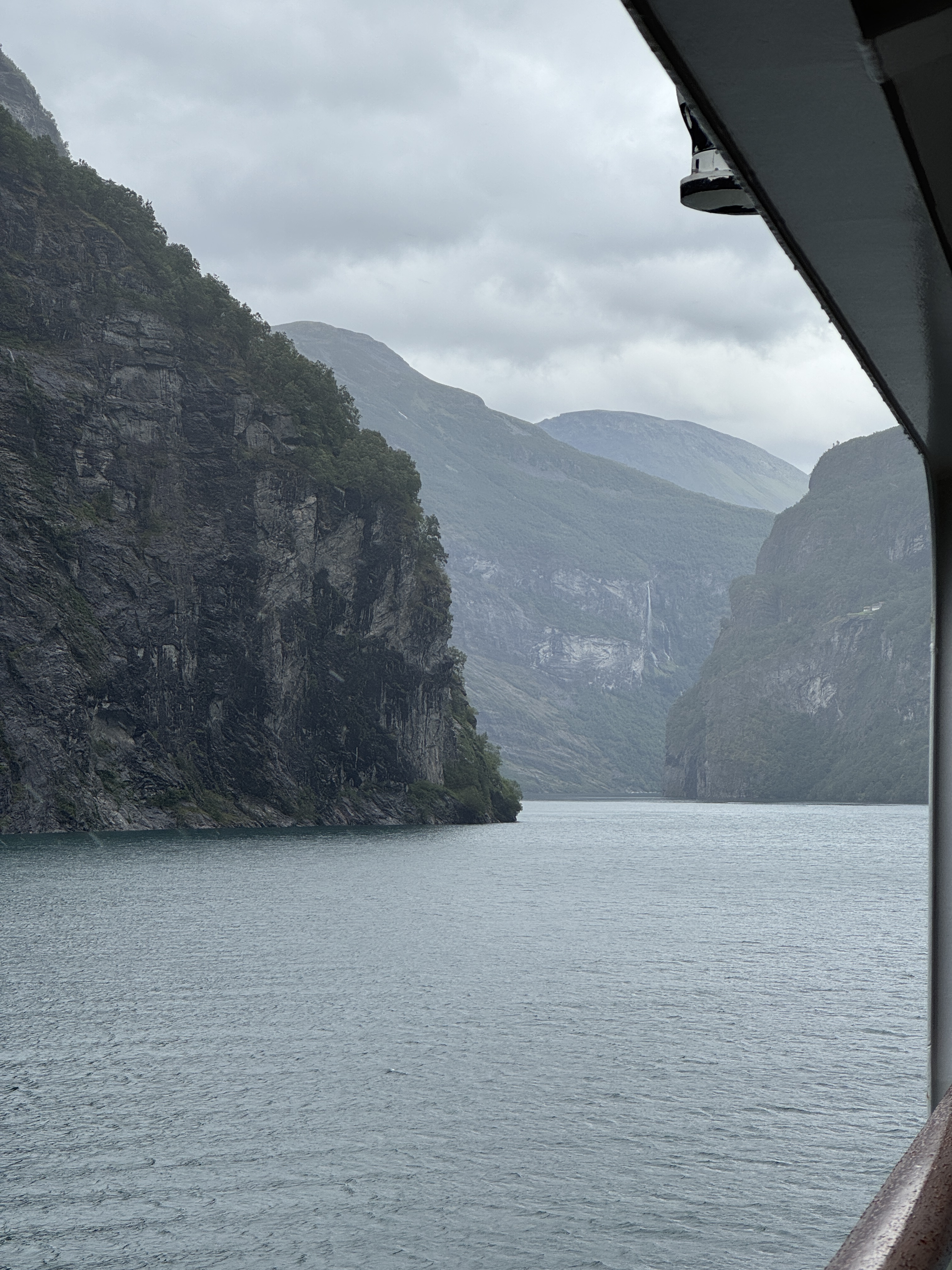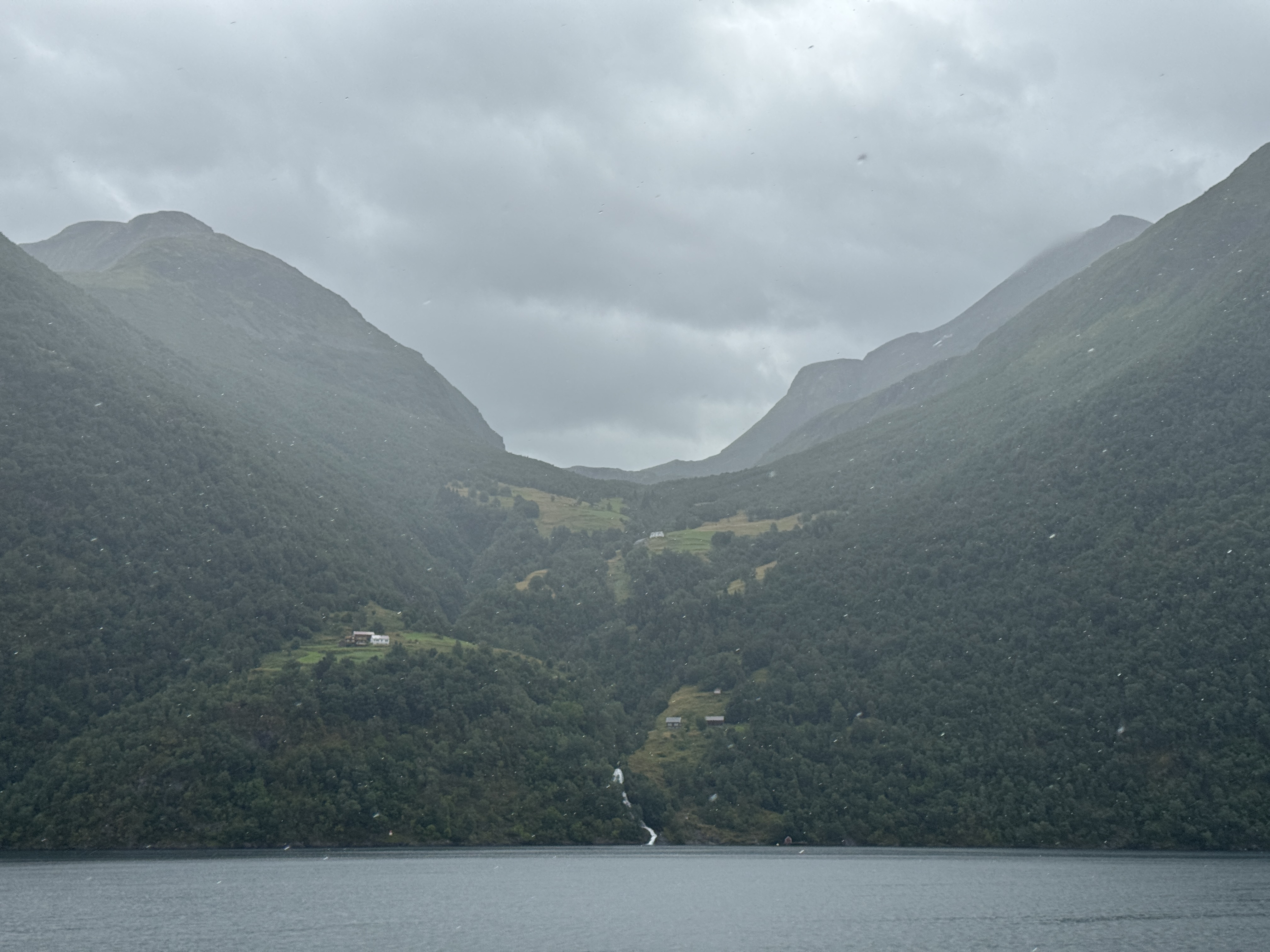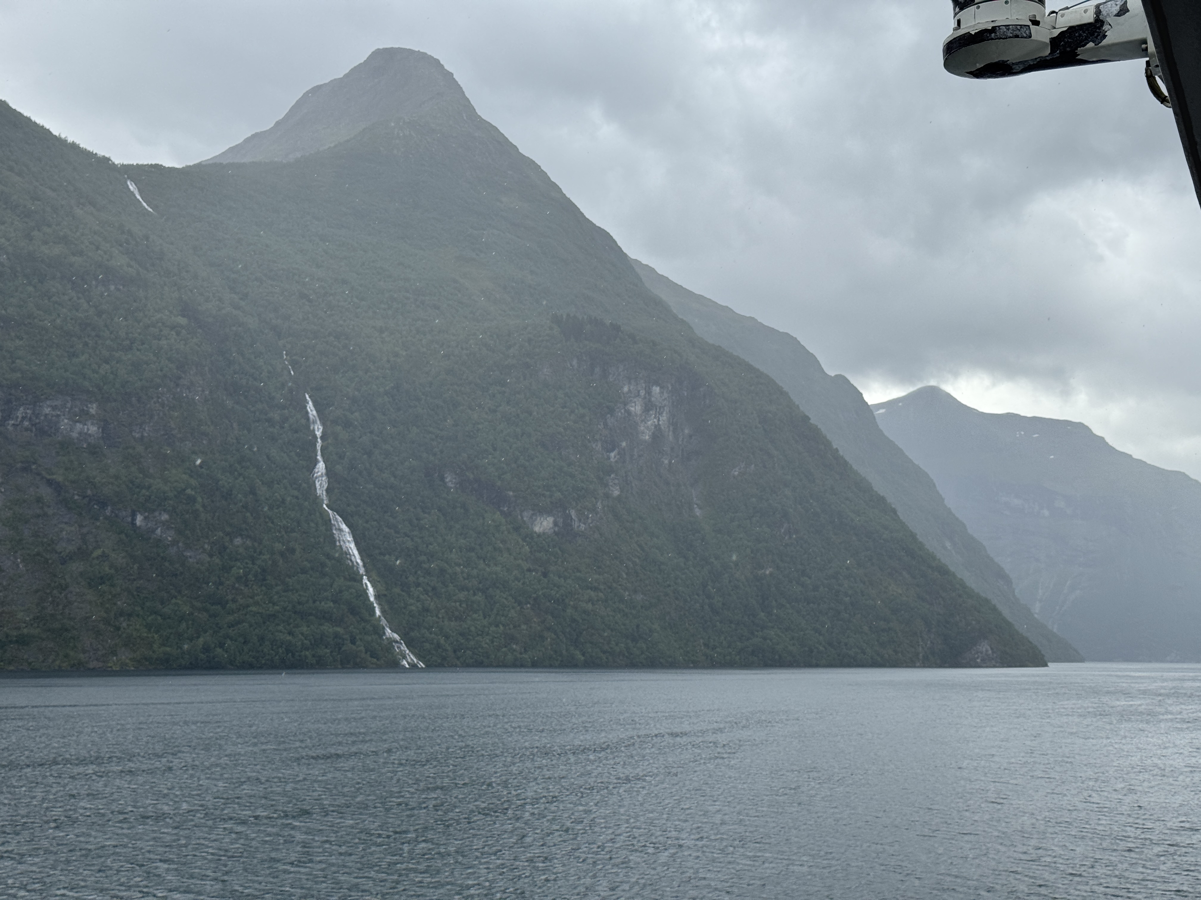 Unfortunately, that changeable weather was in full force for our first excursion. We sailed up Geiranger Fjord, a world heritage site, in mostly cloudy conditions with some spits of rain. At the far end of the fjord we took a tender over to land and got on a bus.
