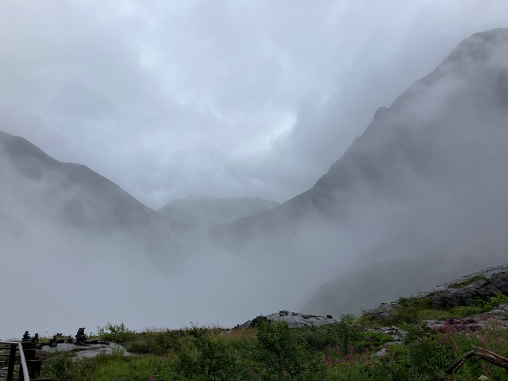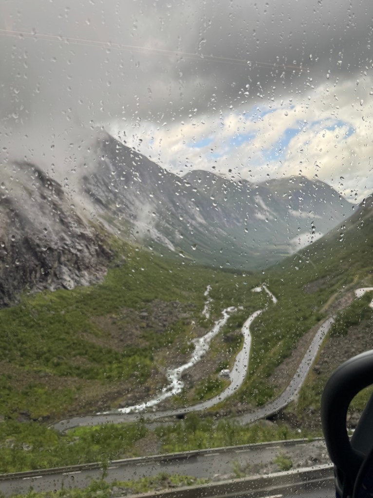 The bus took us to Trollstigen, which has fantastic views down a valley – if it’s clear. Here’s what we saw: