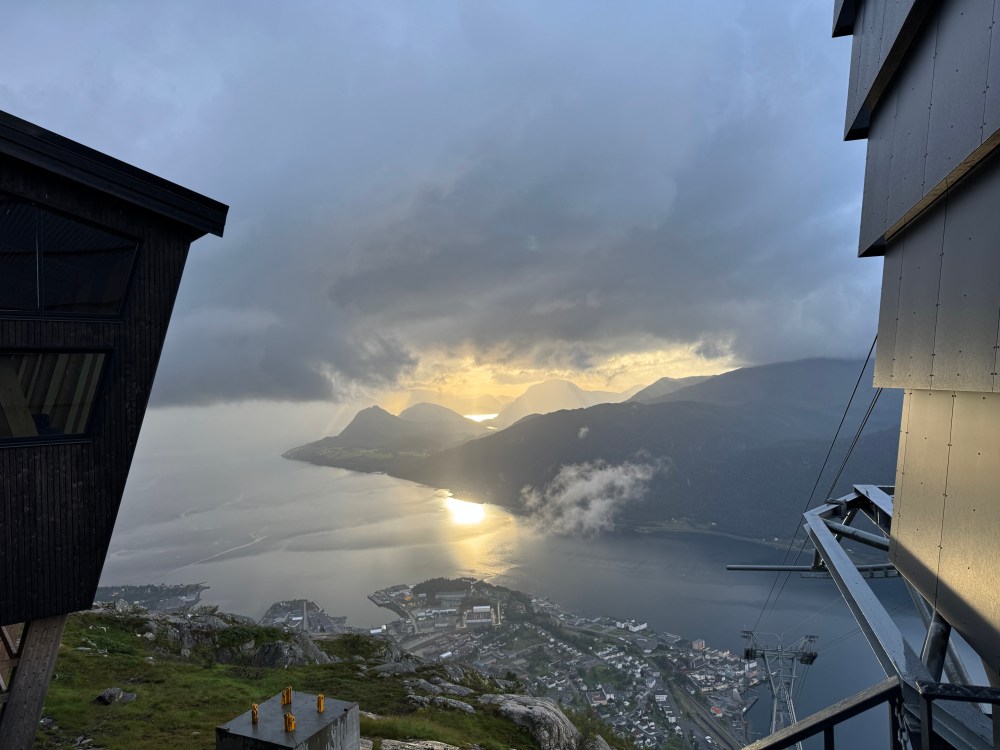 The bus trip ended in Molde, where we took a gondola up to a restaurant for dinner. It was sunny when we got there, cloudy/raining while we ate, and gave a fine view of the setting sun as we left. Norwegian weather at its best!