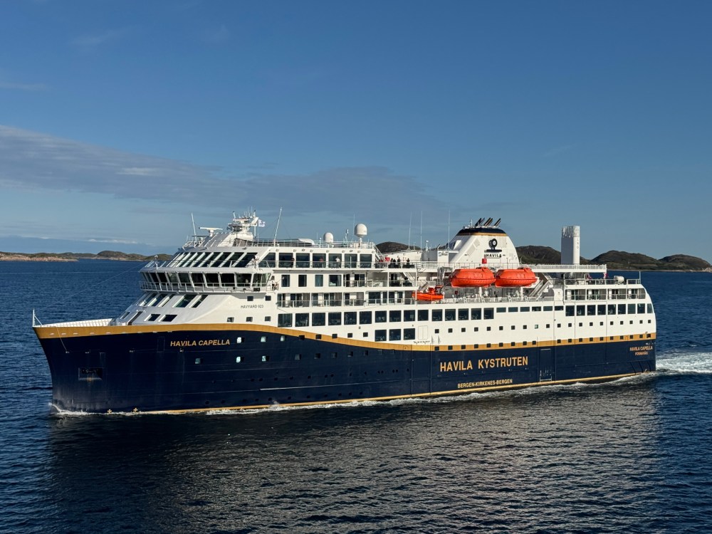 We boarded the Havila Castor a week ago in Bergen. She looks just like her sister ship, Havila Capella, which we passed a few days later: