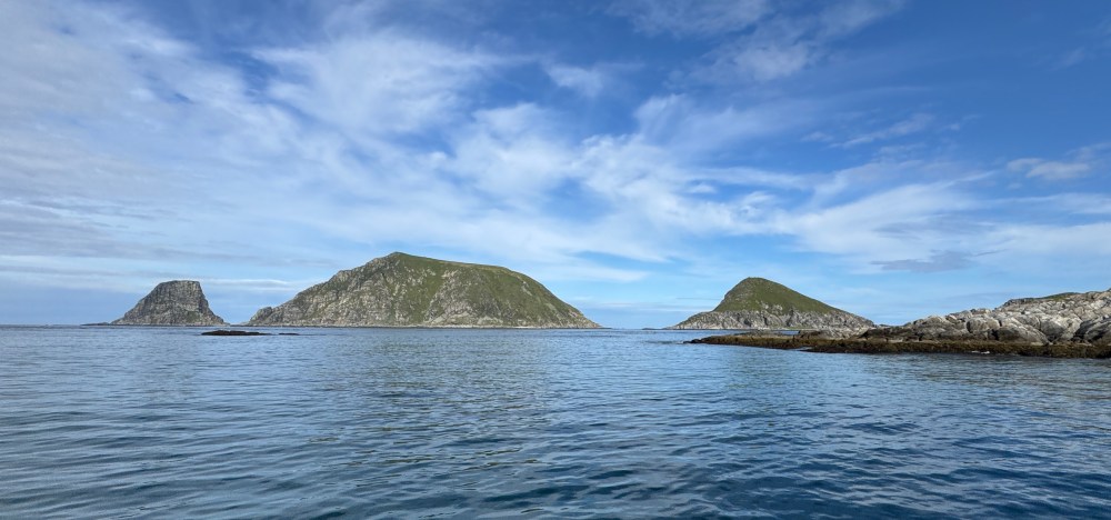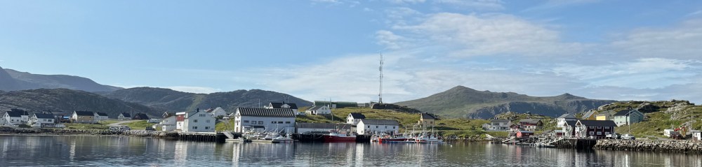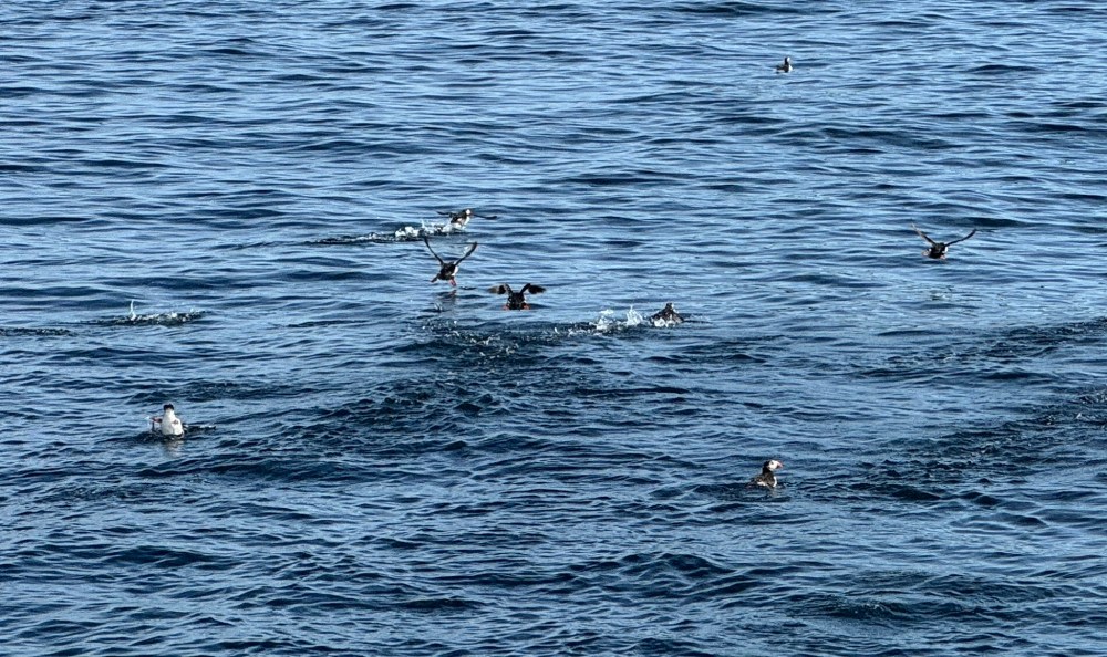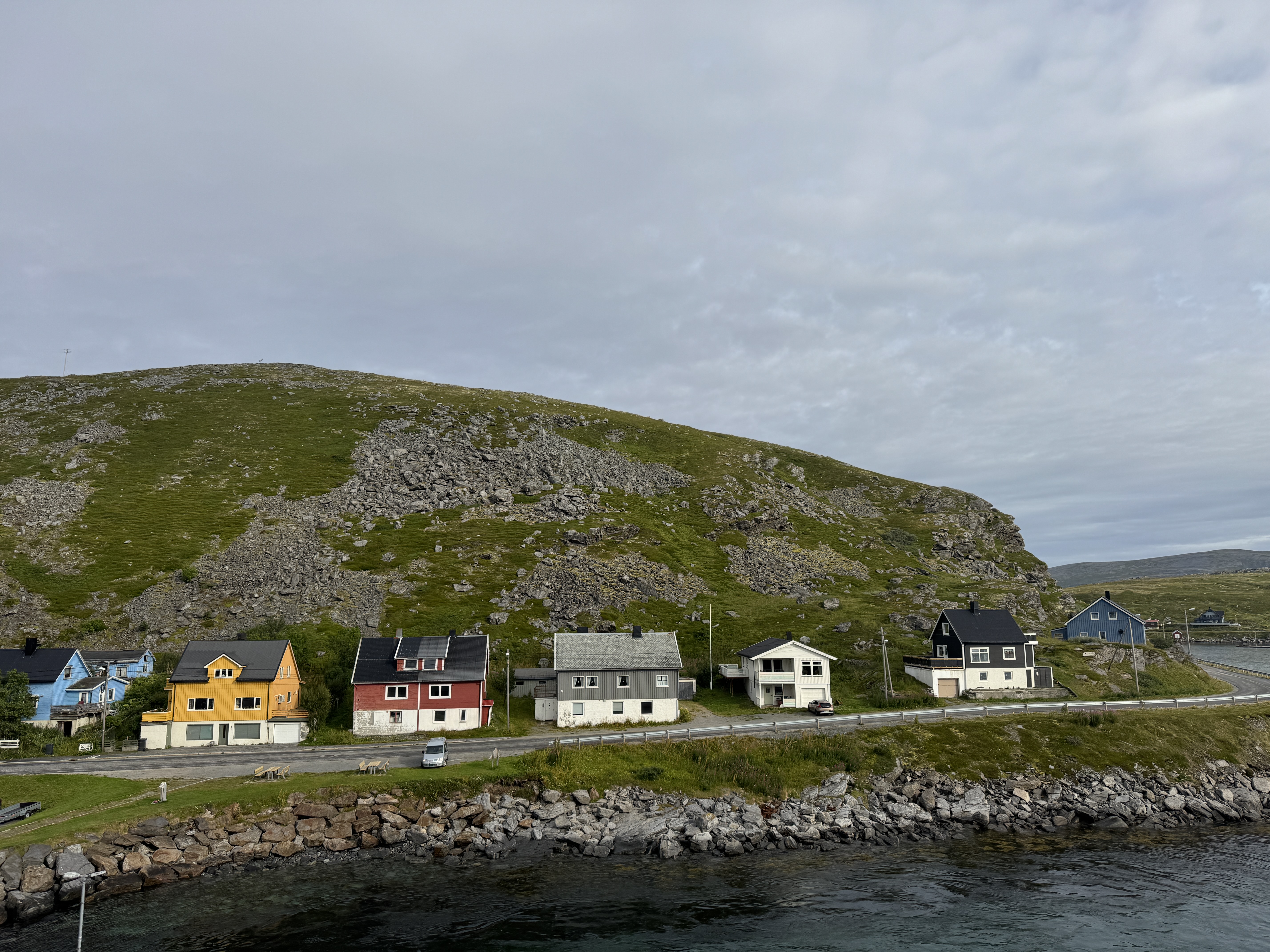 We saw dolphins as we came into Honningsvåg, where we took a bird-watching trip. A bus took across the island to the northern coast. We saw lots of reindeer, which are brought over by the Sami herders for the summer. We headed out from a small fishing village to visit the rocky islands off shore.