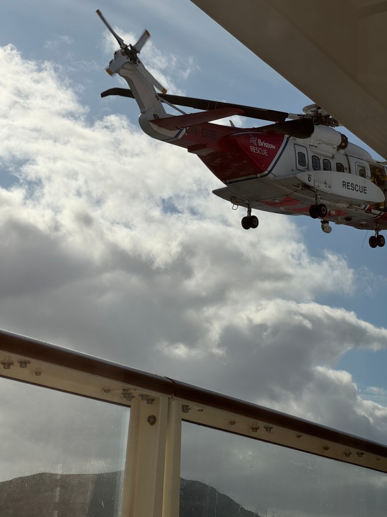 One day they announced a safety drill. I figured it would be us trooping out to the lifeboats (as we did every week when I was an engine room cadet on a steamship). But no – it was a rescue helicopter practicing maneuvers with the ship. They spent a long time really close to the ship!