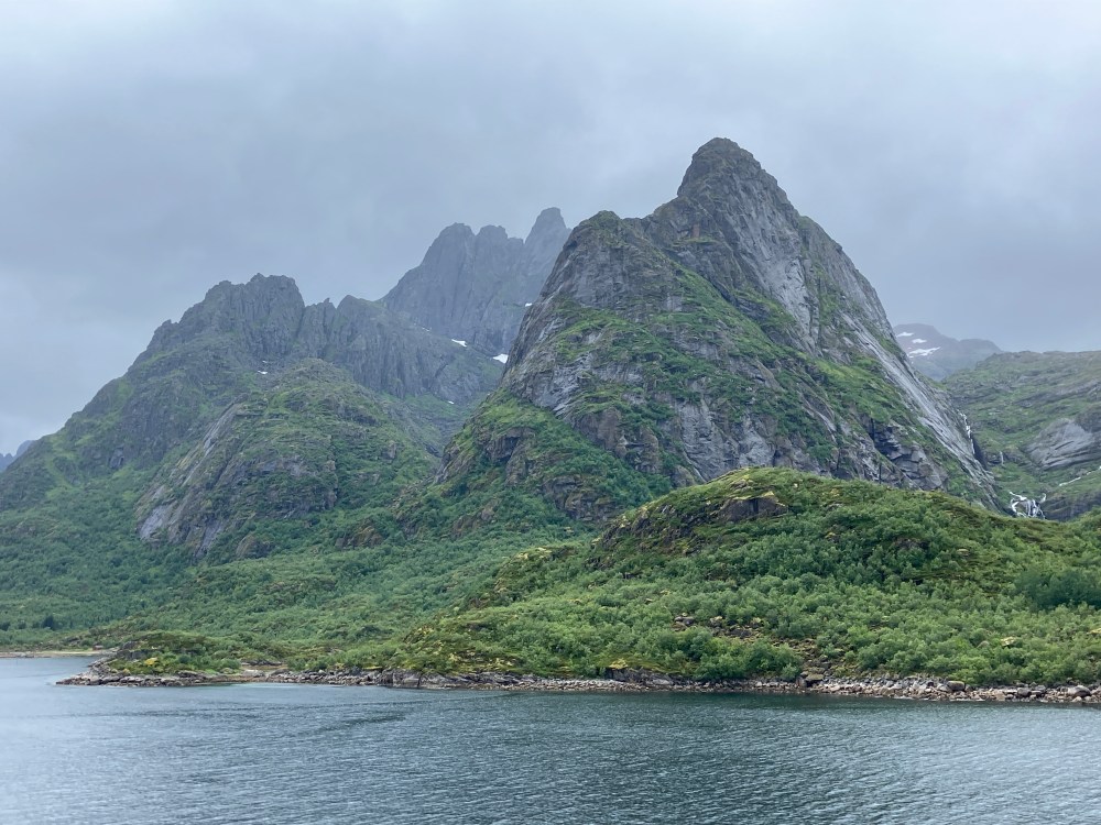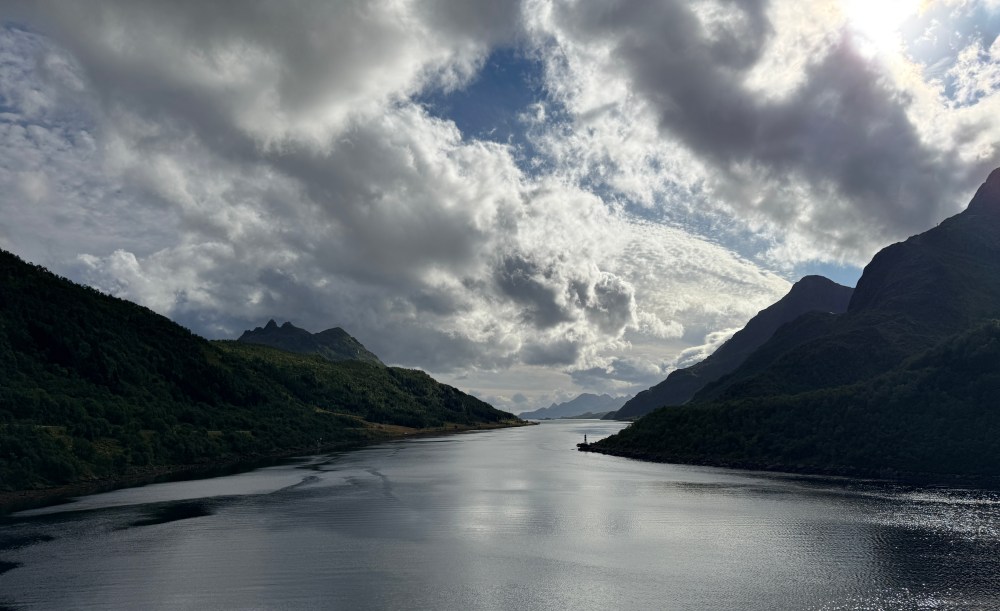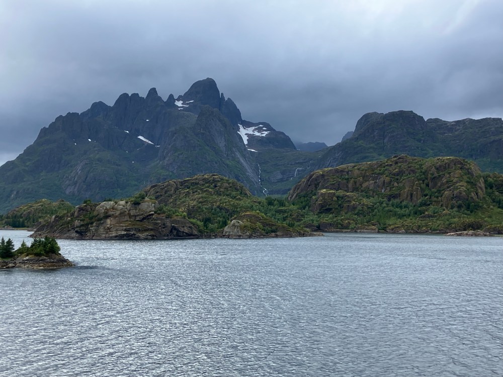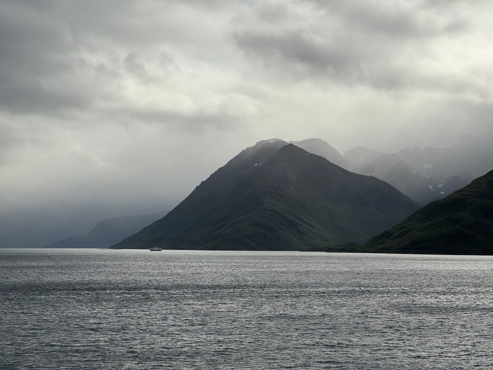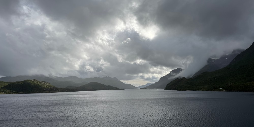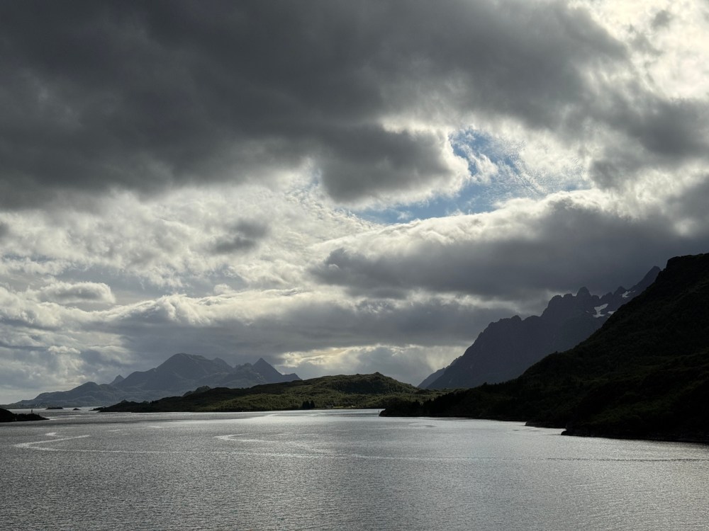 The weather wasn’t as good on our southbound trip from Kirkenes back to Bergen. But it was definitely what we now call “Norway weather” – changing every couple of minutes. Both of our southbound excursions were cancelled, one due to high winds, one due to needing to refuel unexpectedly (presumably also due to high winds and bigger seas than expected). But that still left us with plenty of great views – usually with dramatic clouds.