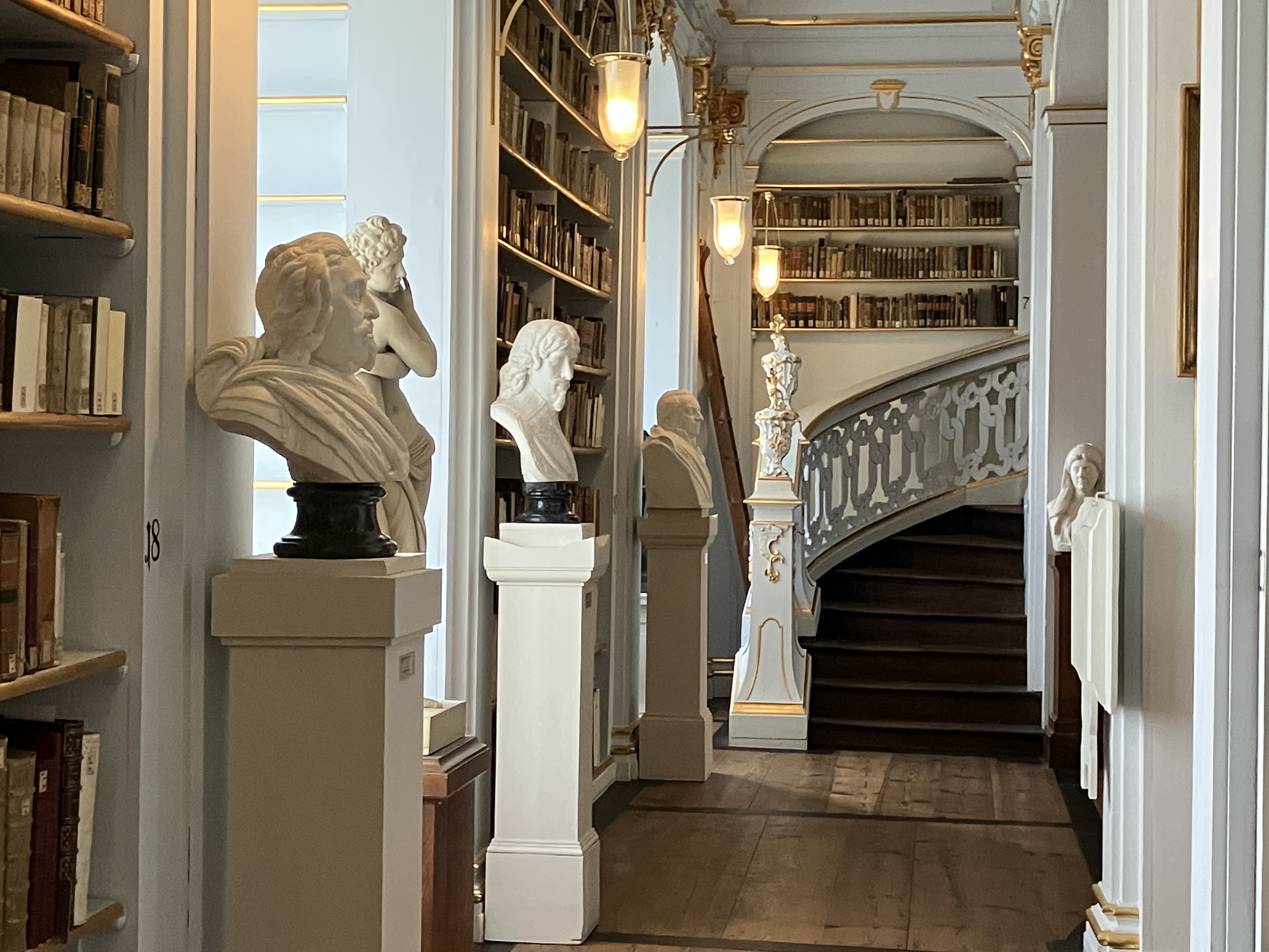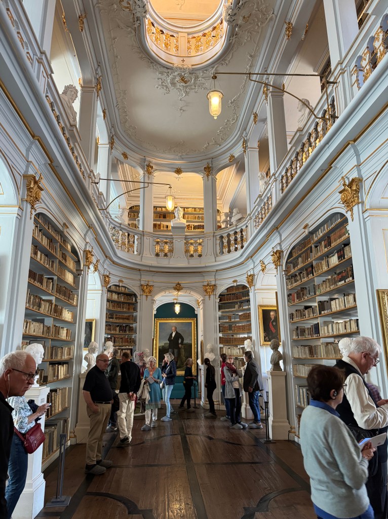 We toured the Duchess Anna Amalia’s gorgeous rococo library, which was managed for decades by, yes, you guessed it, Goethe. Presumably he was allowed to walk around in his regular shoes, not with the big felt slippers we had to shuffle around with. Notice how the tallest books are on the bottom shelf and the shortest on the top, making the bookshelves look taller than they are.