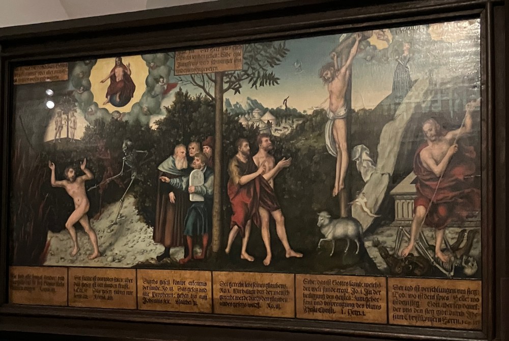 Downstairs was an exhibit from two artists named Cranach, father and son, of whom we’d never heard. As the audio guide went into great detail about the painting below, naming the saints and towns in each scene, I started to wonder how art historians figure out who’s who in all these old paintings. Then I noticed the written description included in the painting. Duh. However, it did emphasize that every single thing in these paintings has meaning – you just have to be able to figure it out.