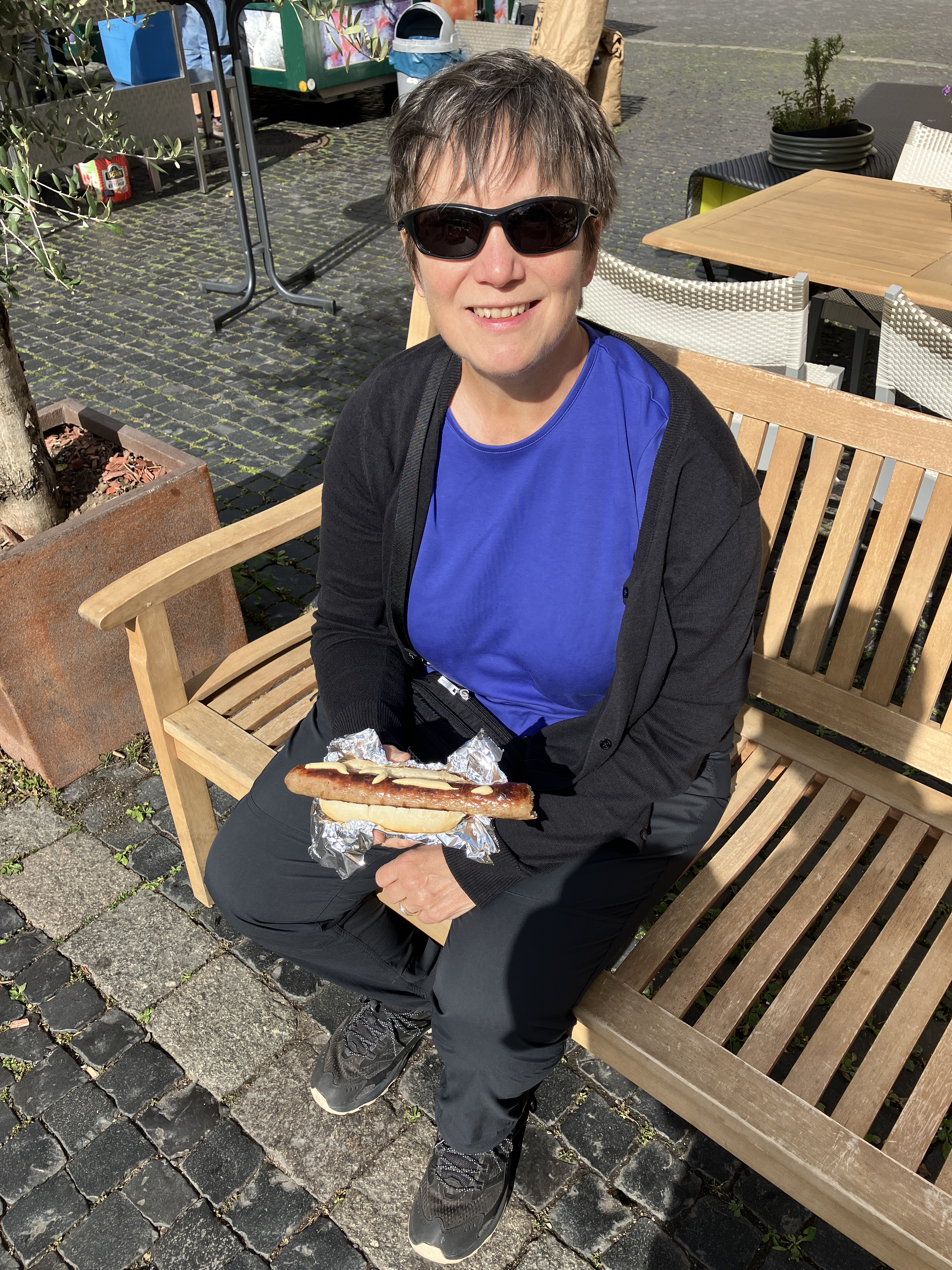 Back out on the streets, it was time to try the local sausage (wurst). Every area in Germany has their specialty. Here it’s a long sausage on a small bun.