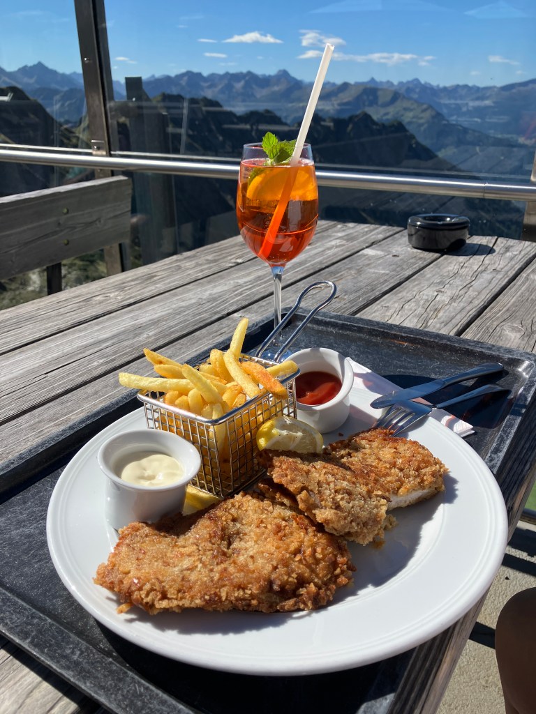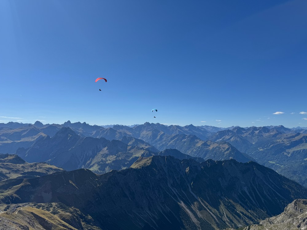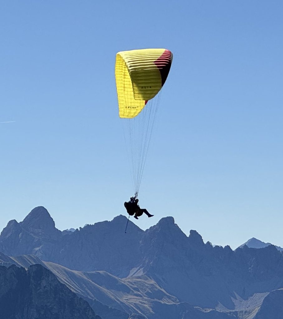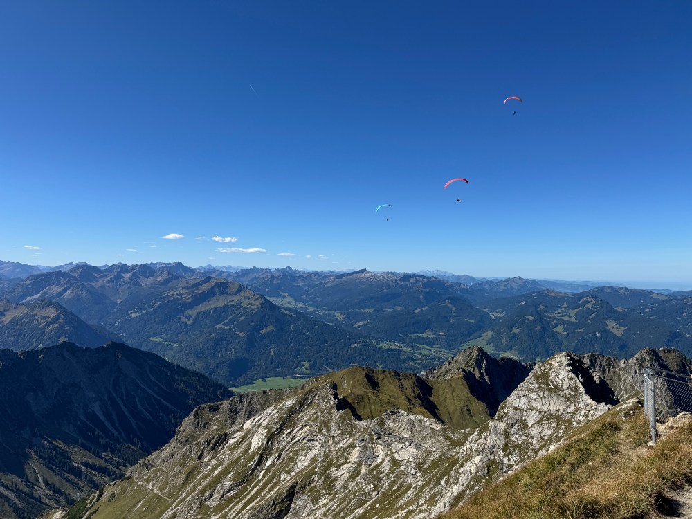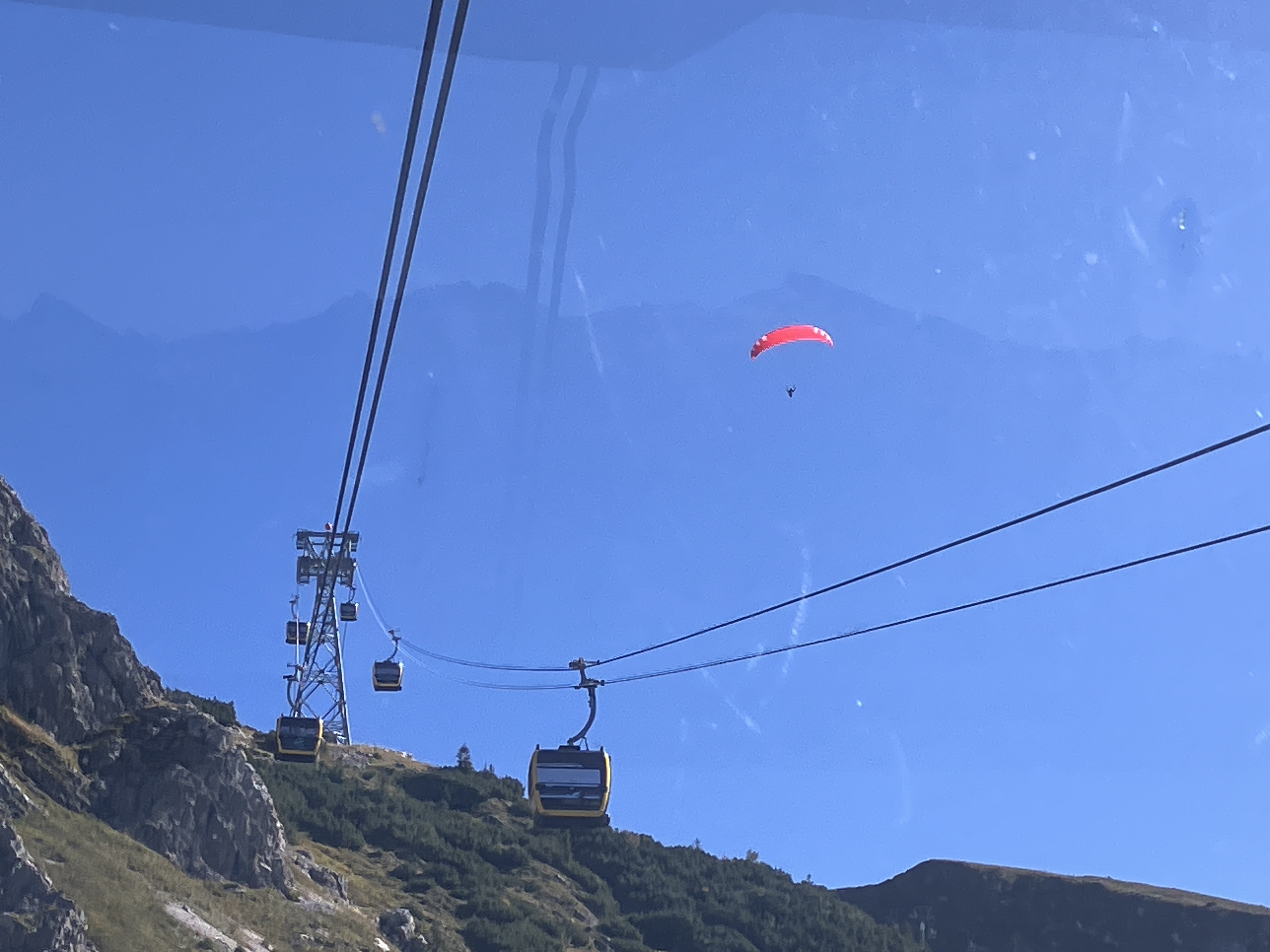 We took gondolas up to the panorama view on top of the Nebelhorn and it was just as spectacular as we remembered. (And I told myself several times -it’s Germany, I’m sure they maintain these better than that one in Lisbon…) This time there were many parasails around the peak – singles and tandems. Perhaps next time we’ll try tandem rides. If the first President Bush can do a tandem sky dive at 90, M can do a tandem parasail at 75, no?