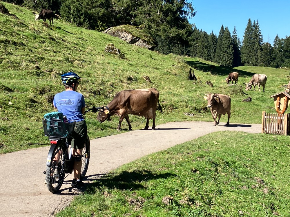 The first four days of our visit were blessed with fantastic weather. We rented e-bikes on two days and biked out into narrow valleys connected to the larger area where the town sits. Thanks to the e-bikes, we climbed a long 10% grade and were rewarded with a mountain farmstead with gorgeous views … and cows standing in the road. Other bikers were more blasé than we were and just biked right by; we waited for a little more clearance.