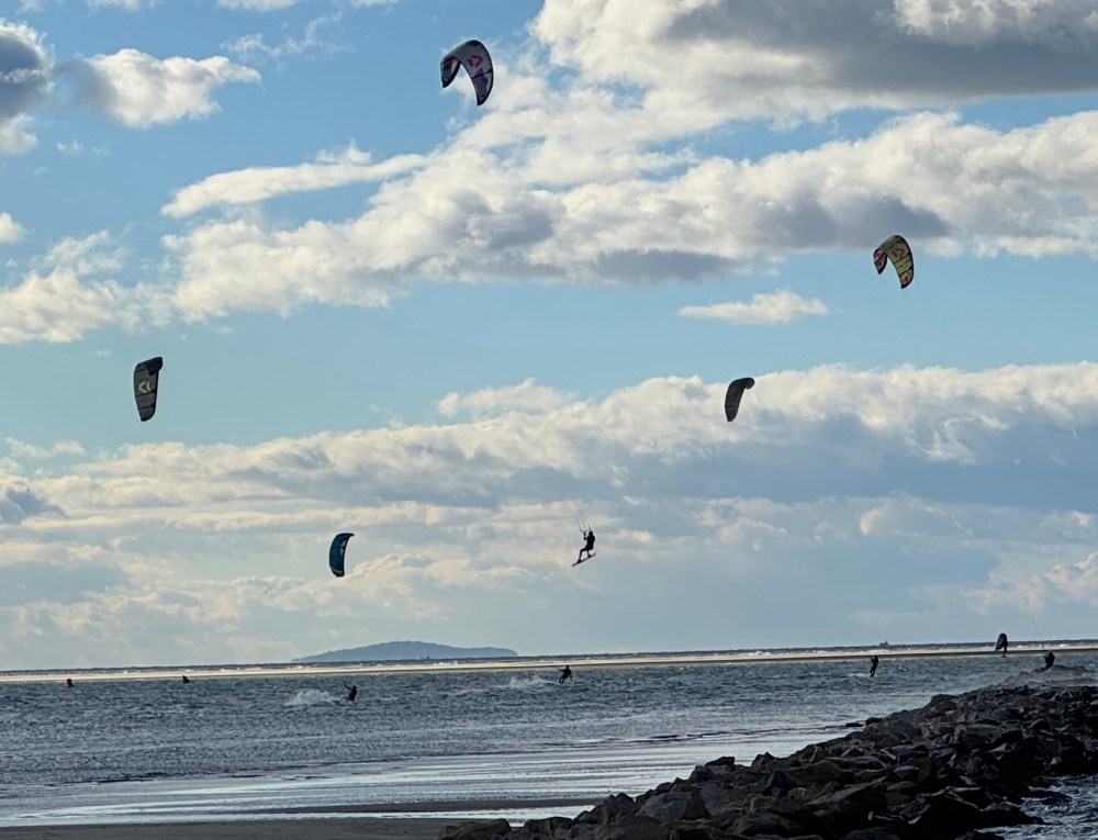 It was really windy on Wednesday when we visited Le Grau-du-Roi. As we parked behind the dunes, we could see a bunch of kites over the water. As we emerged from a passage through the dunes, we saw one of the kitesurfers fly up about 10m (30 ft) in the air and wipe out – board going one way, him tumbling head over heels. Holy crap! We didn’t have our cameras out at that point, but we did see many other adrenalin junkies flying through the air – though none so high, and none wiping out.