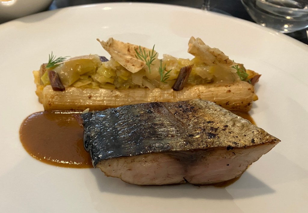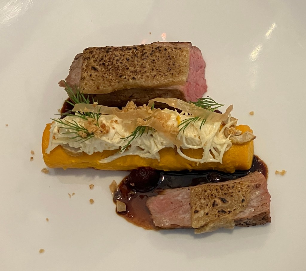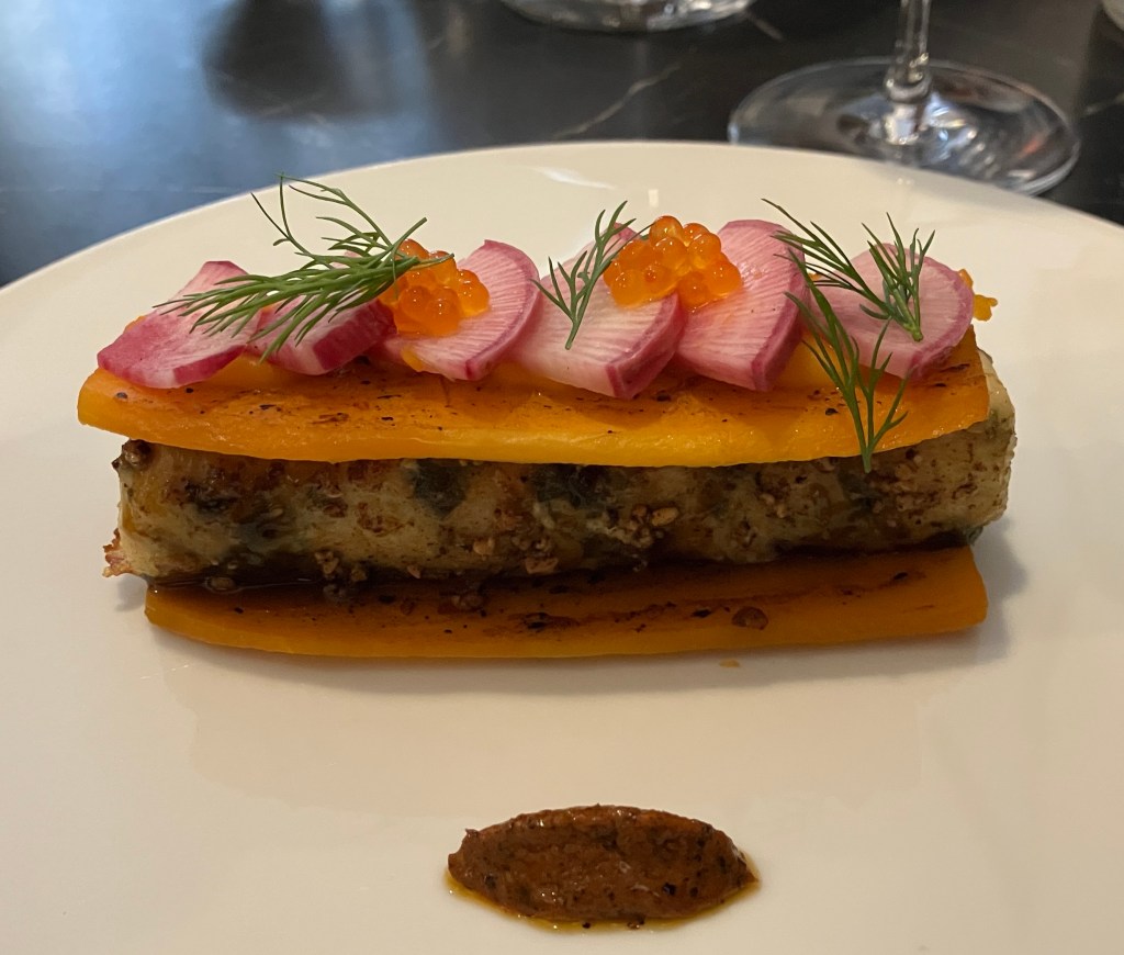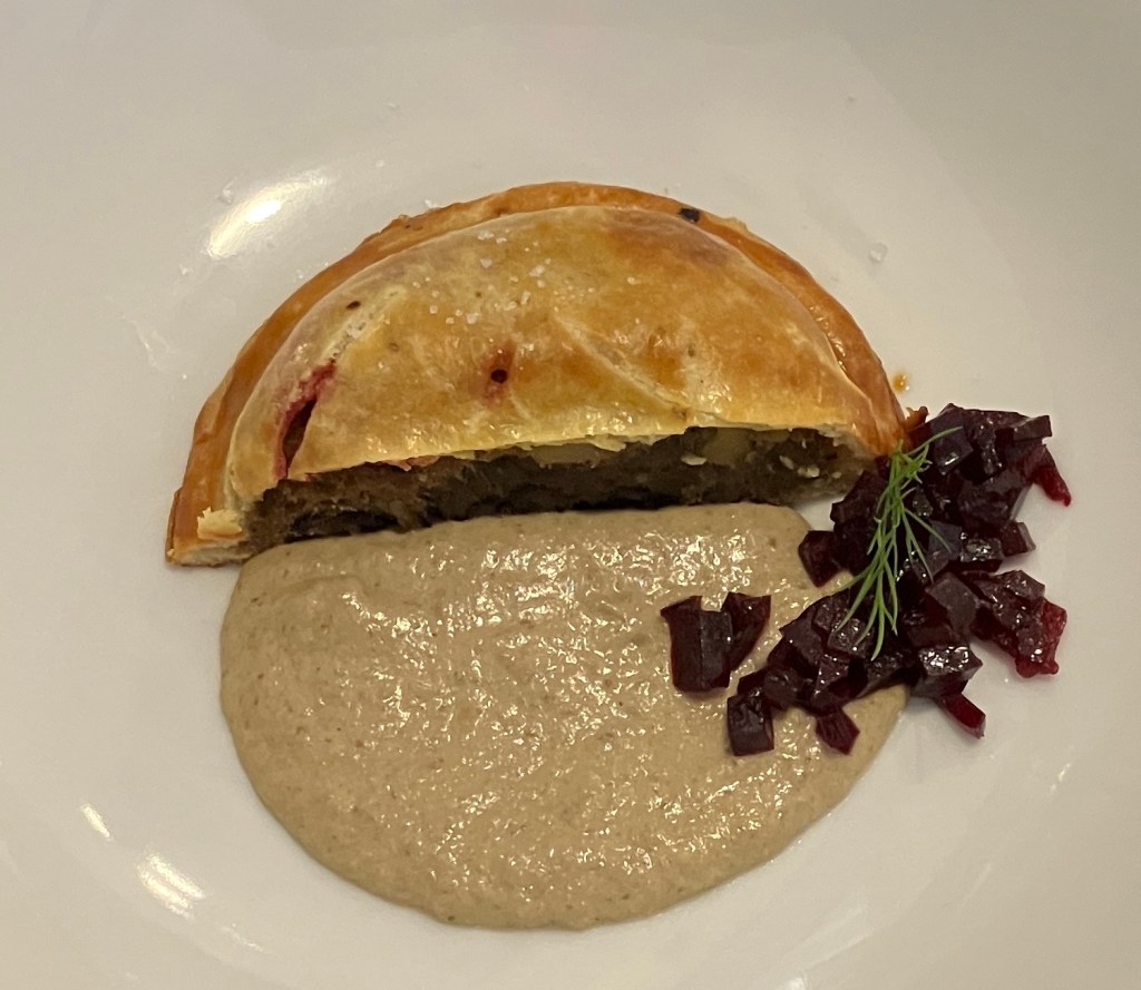 From top left, clockwise: shrimp ‘log’, meat pie with mushroom cream, veal with a squash side, skipjack tuna with roasted leeks.