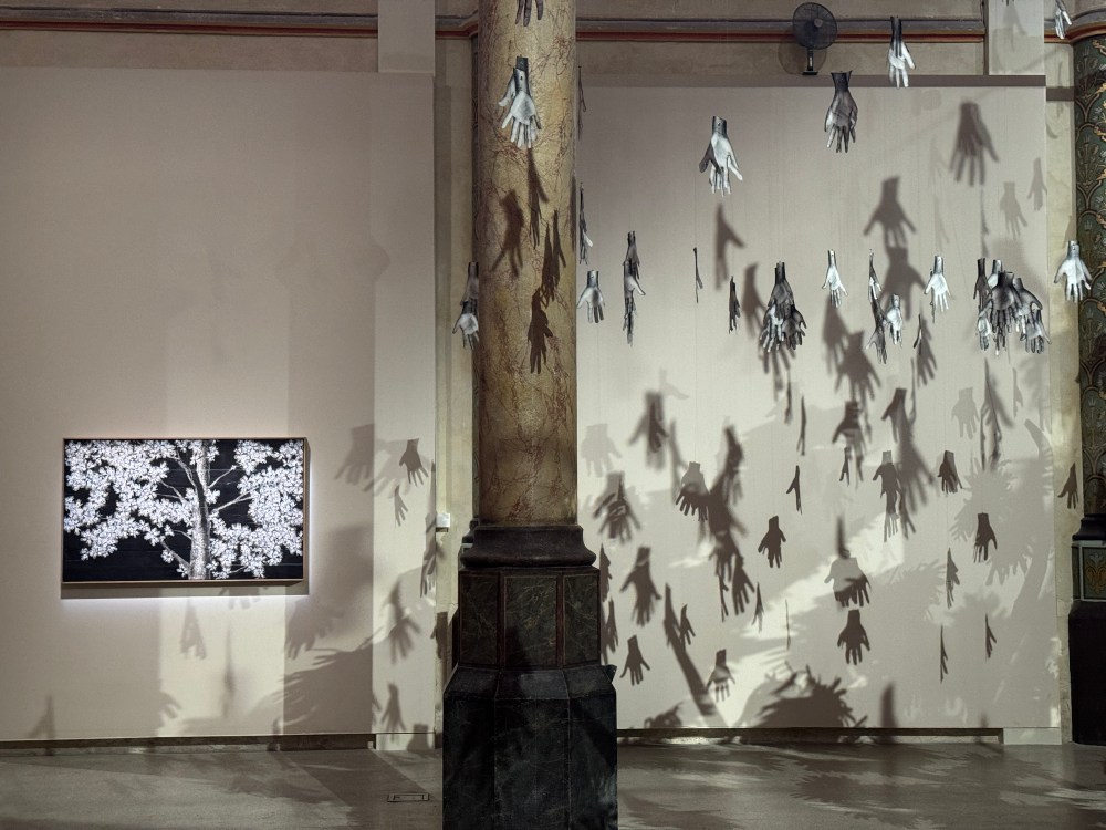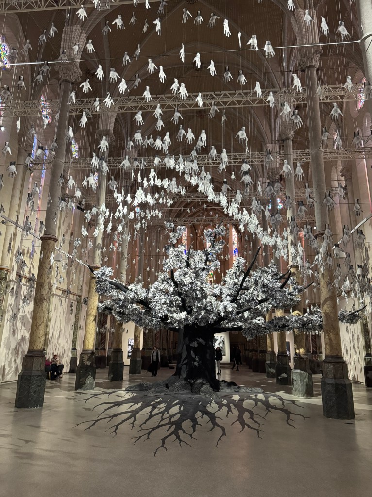 Surprise! It’s now a place to worship art, not God. A tree with hand cutouts as leaves filled the space, while fans blew gently to make continually changing shadows on the walls. The walls had additional art, all featuring trees with hand leaves. Very cool!